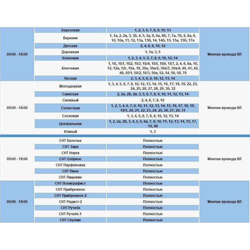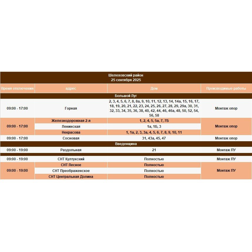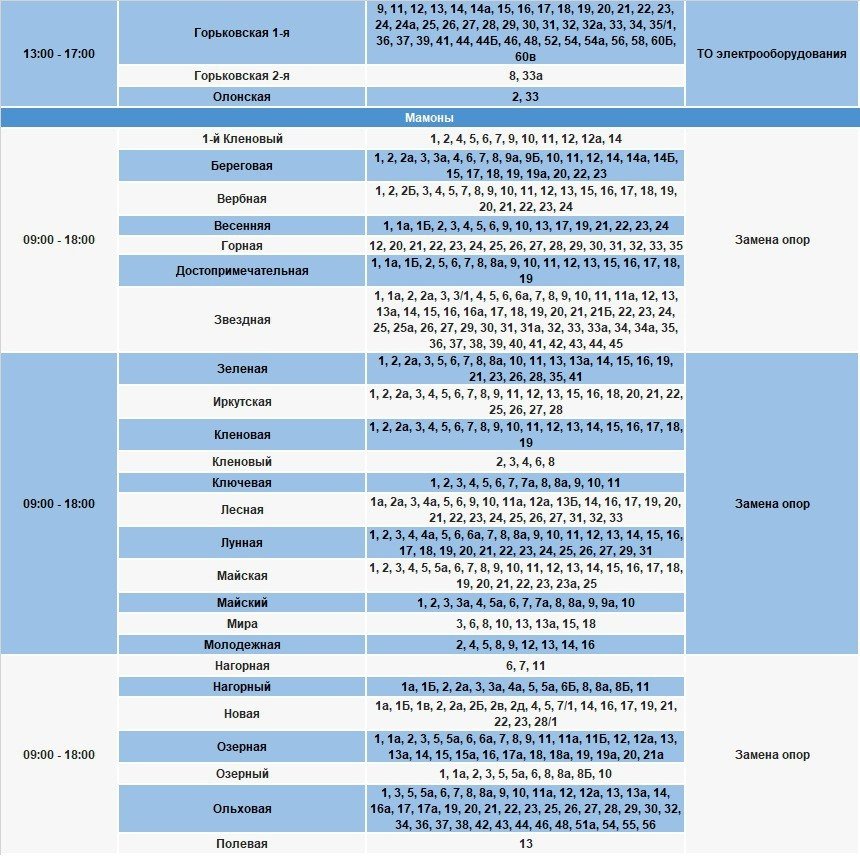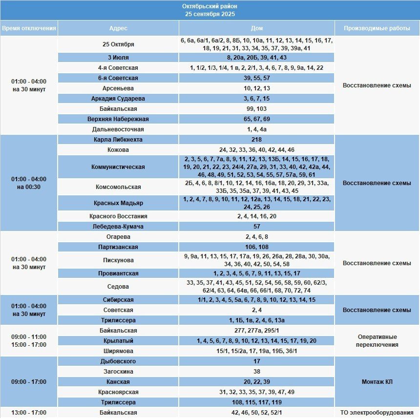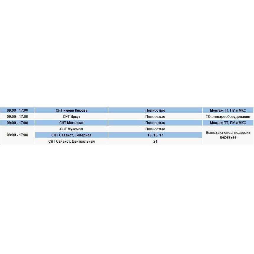 25 сентября будет частично ограничено электроснабжение в Иркутске, Марковском МО и Шелеховском районе. Электроэнергиии не будет в связи с проведением плановых работ на сетях, пишет ИА IrkutskMedia со ссылкой на тг-канал (18+) "СВЕТ38".