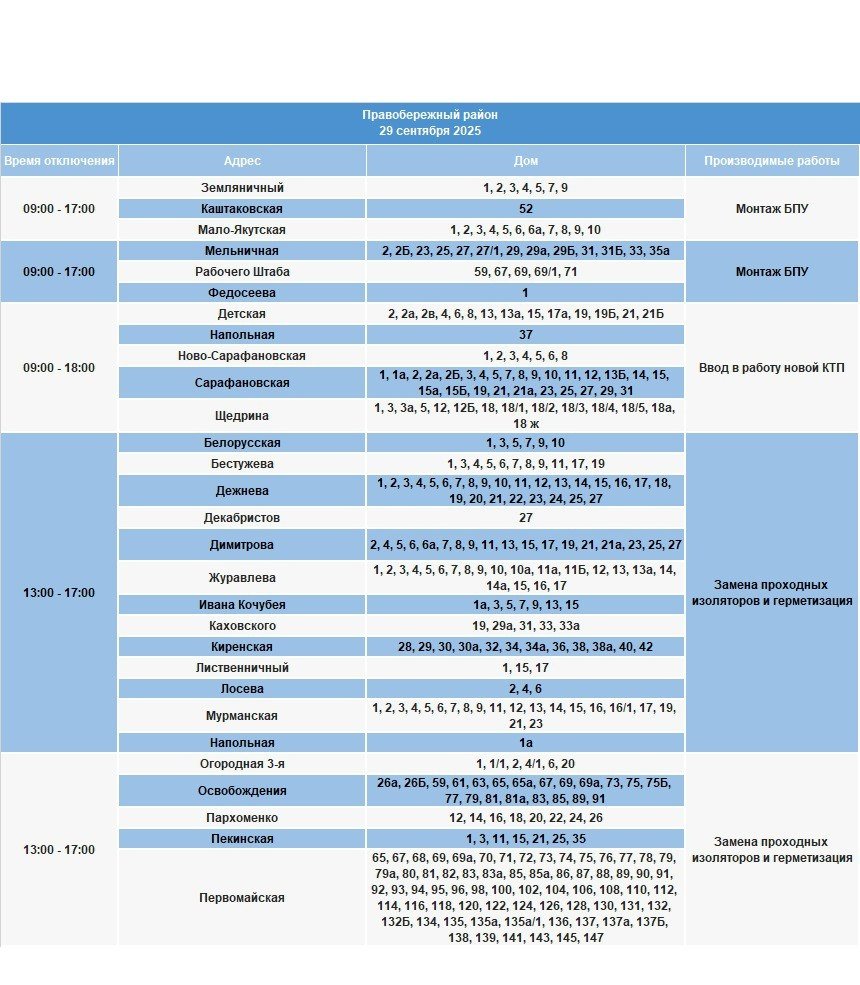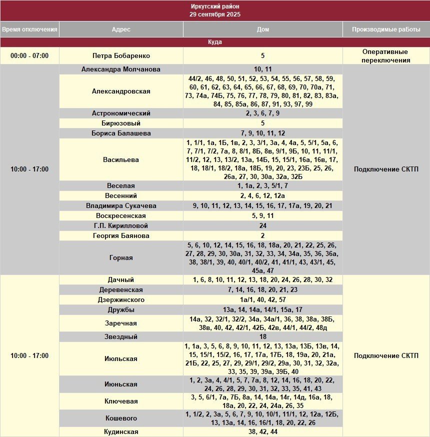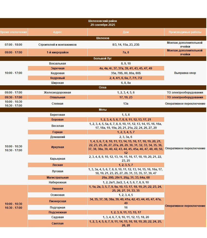 29 сентября частично отключат электричество в населенных пунктах Иркутской области. Как уточняют энергетики, электроснабжение будет ограничено в связи с проведением плановых работ на сетях, пишет ИА IrkutskMedia со ссылкой на тг-канал (18+) "СВЕТ38".