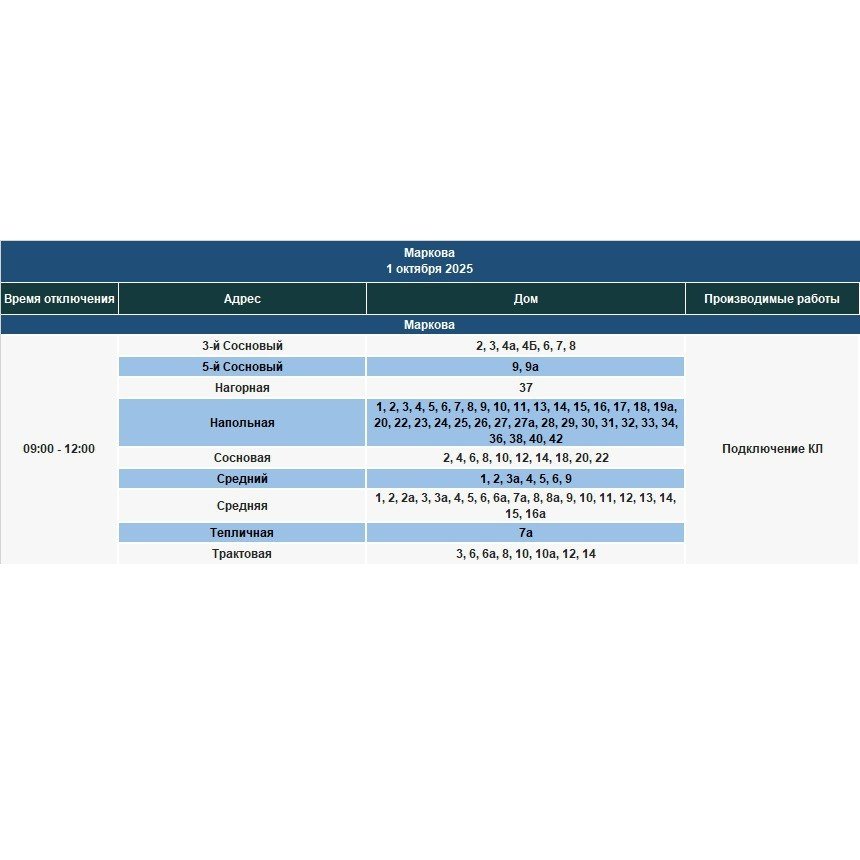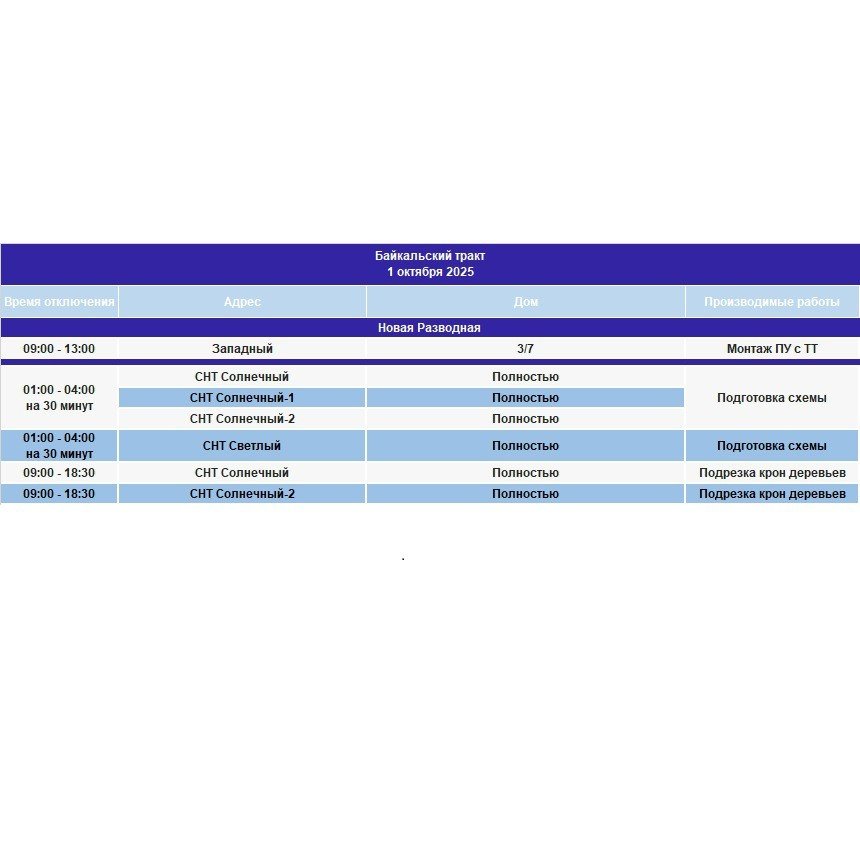 Ряд населенных пунктов Иркутского района частично обесточат 1 октября для проведения плановых работ. Под отключение попадет часть СНТ по Байкальскому тракту, поселок Новая Разводная, Смоленщина и Маркова. Об этом сообщает ИА IrkutskMedia со ссылкой на тг-канал "СВЕТ38" (18+).