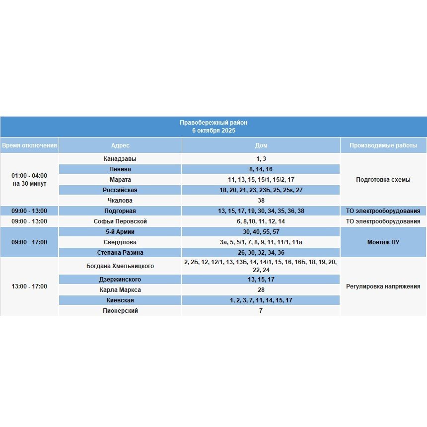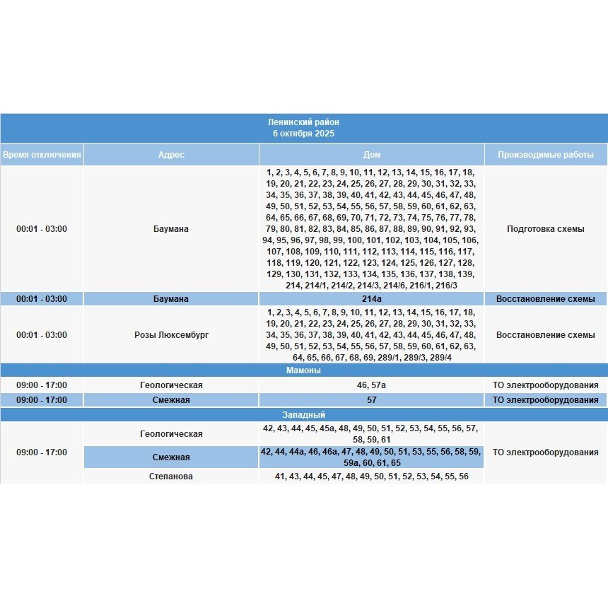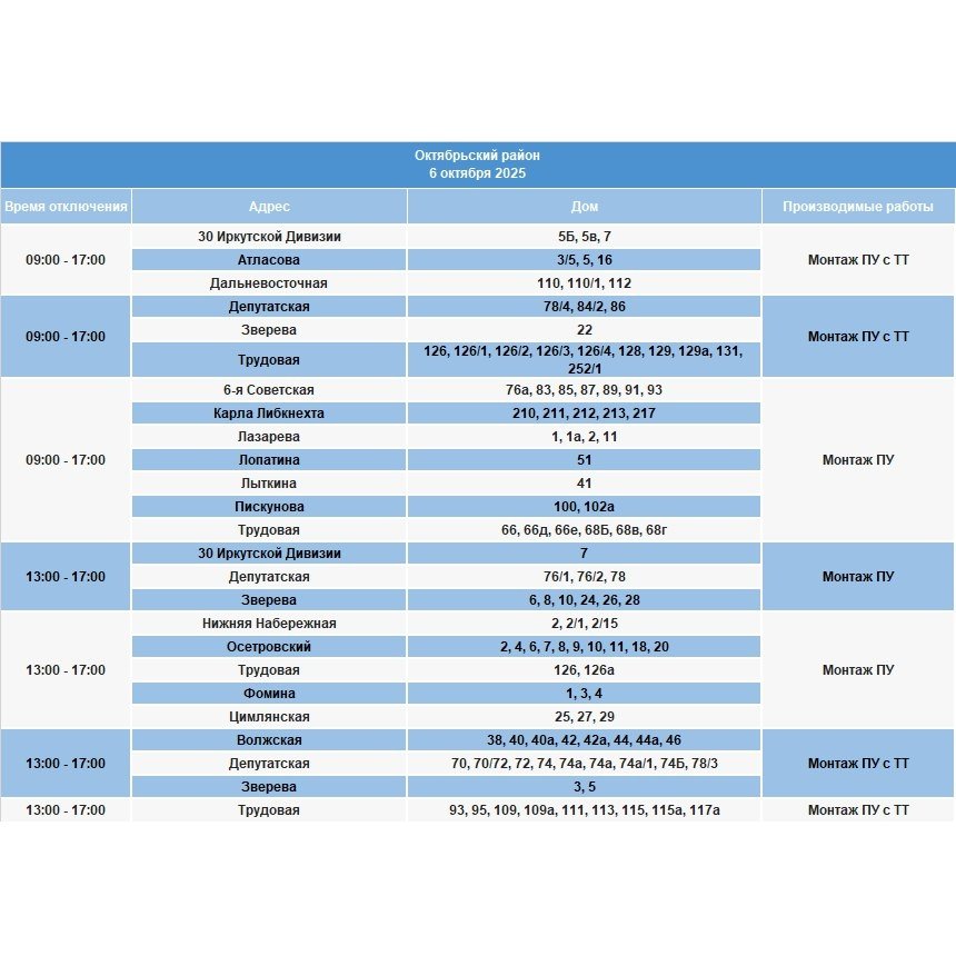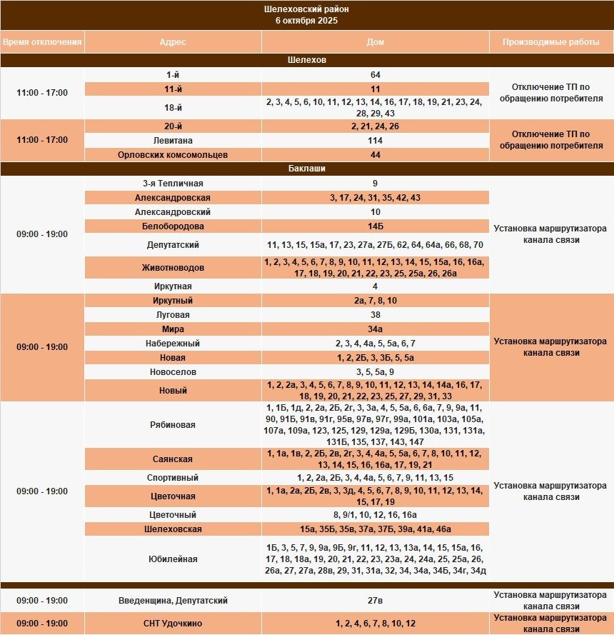 6 октября частично отключат электричество в населенных пунктах Иркутской области. Как уточняют энергетики, электроснабжение будет ограничено в связи с проведением плановых работ на сетях, пишет ИА IrkutskMedia со ссылкой на тг-канал (18+) "СВЕТ38".