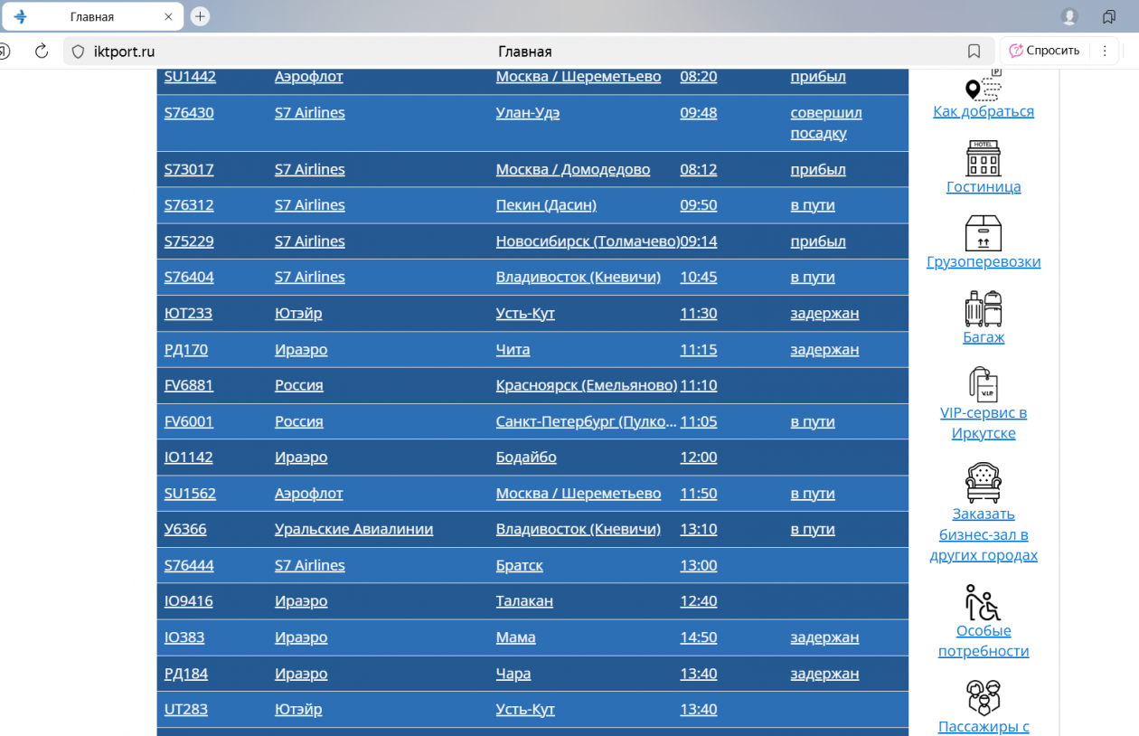С опозданием приземлятся самолёты из Усть-Кута, Читы, Мамы и Чары. Также задерживается вылет четырёх рейсов. Позже вылетят борта в Маму и Нерюнгри (Чульман) и два самолёта в Нючакан.