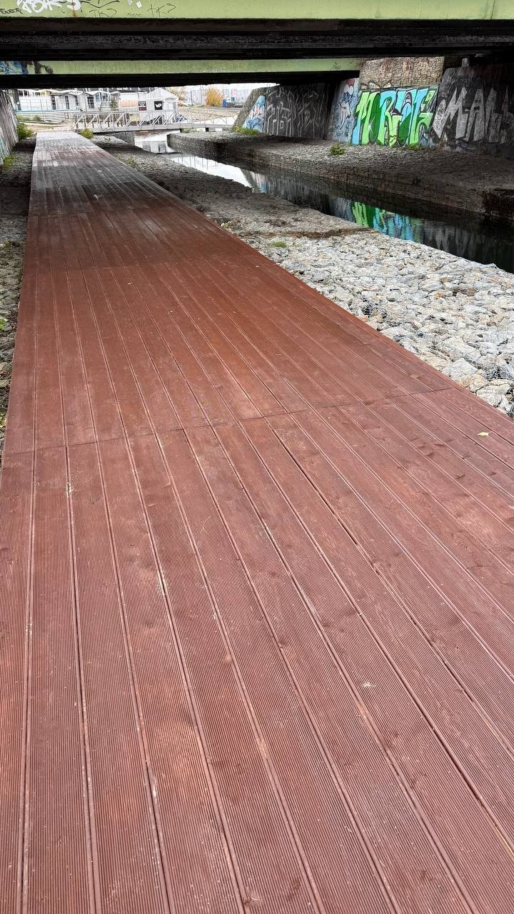 Вторым местом, где нужно было заменить часть настила, стала пешеходная дорожка под автомобильным мостом через залив Иркутского водохранилища в микрорайоне Солнечном. Этот участок на содержание МКУ передали этой осенью.