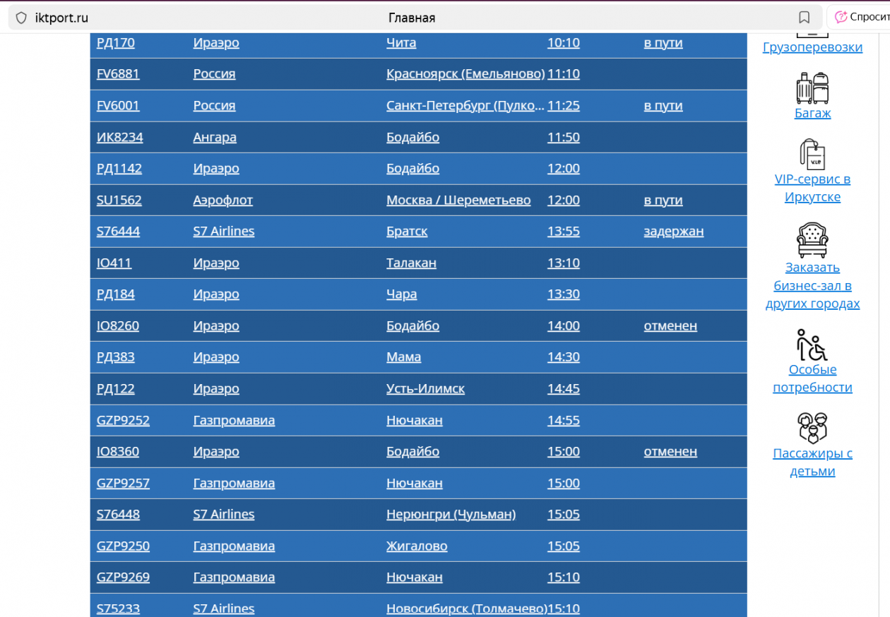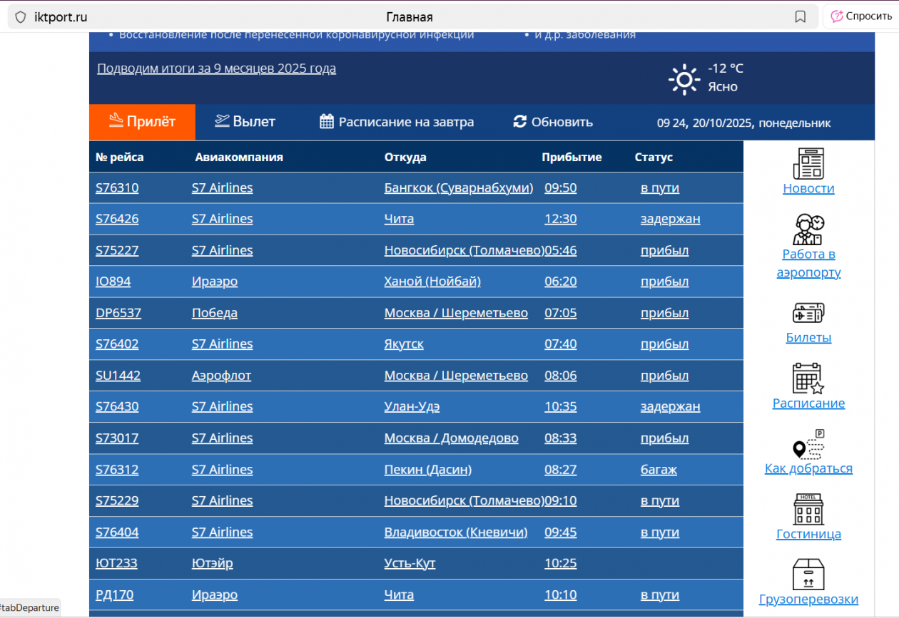 IrkutskMedia, 20 октября. Сегодня в аэропорт Иркутска прибудут с опозданием три рейса. Согласно информации с официального сайта воздушной гавани, сегодня задерживаются борта из Читы, Улан-Удэ и Братска.