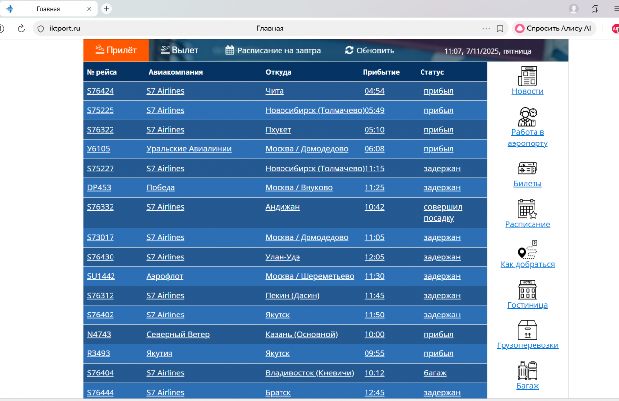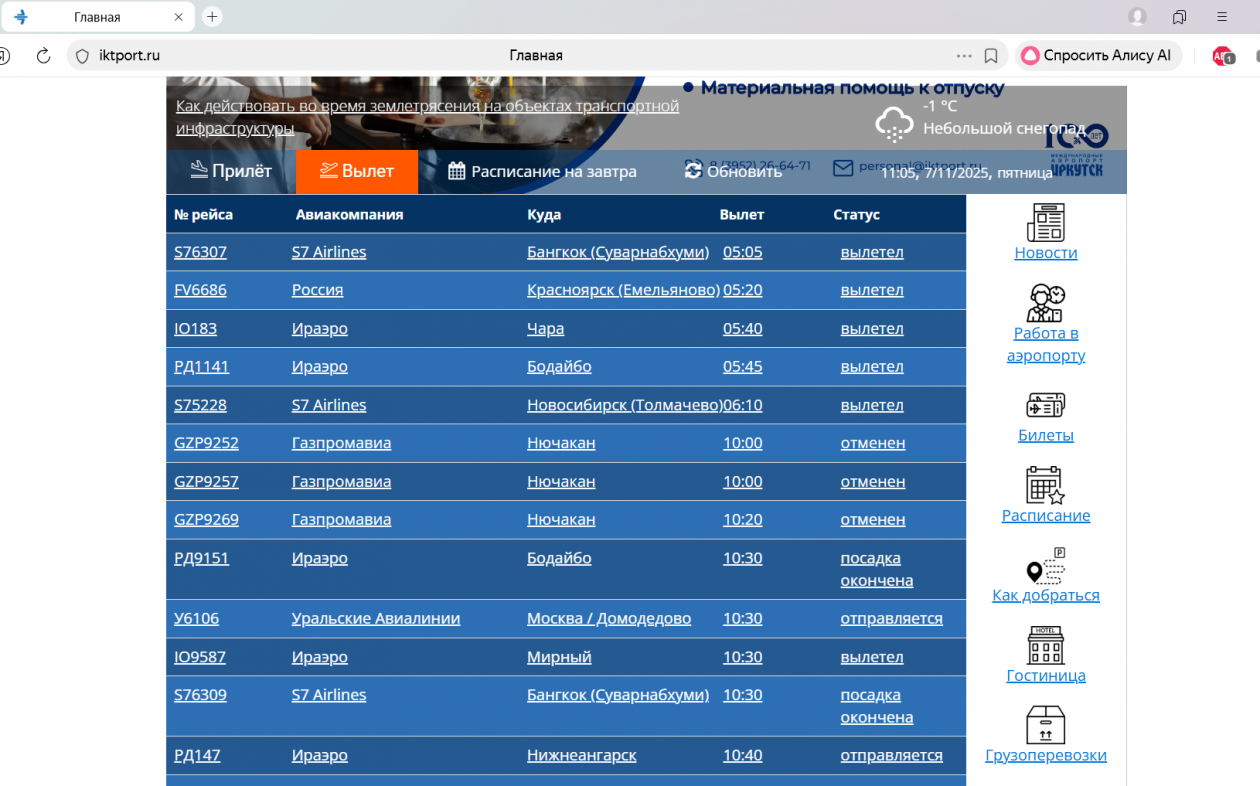 IrkutskMedia, 7 ноября. В иркутском аэропорту задерживается прибытие и отправление 19 рейсов. Самолёты опаздывают из-за снегопада. Задерживается прибытие 13 бортов из Новосибирска, Москвы, Улан-Удэ, Пекина, Якутска, Усть-Кута, Красноярска, Бодайбо. Три рейса из Нючакана были отменены.