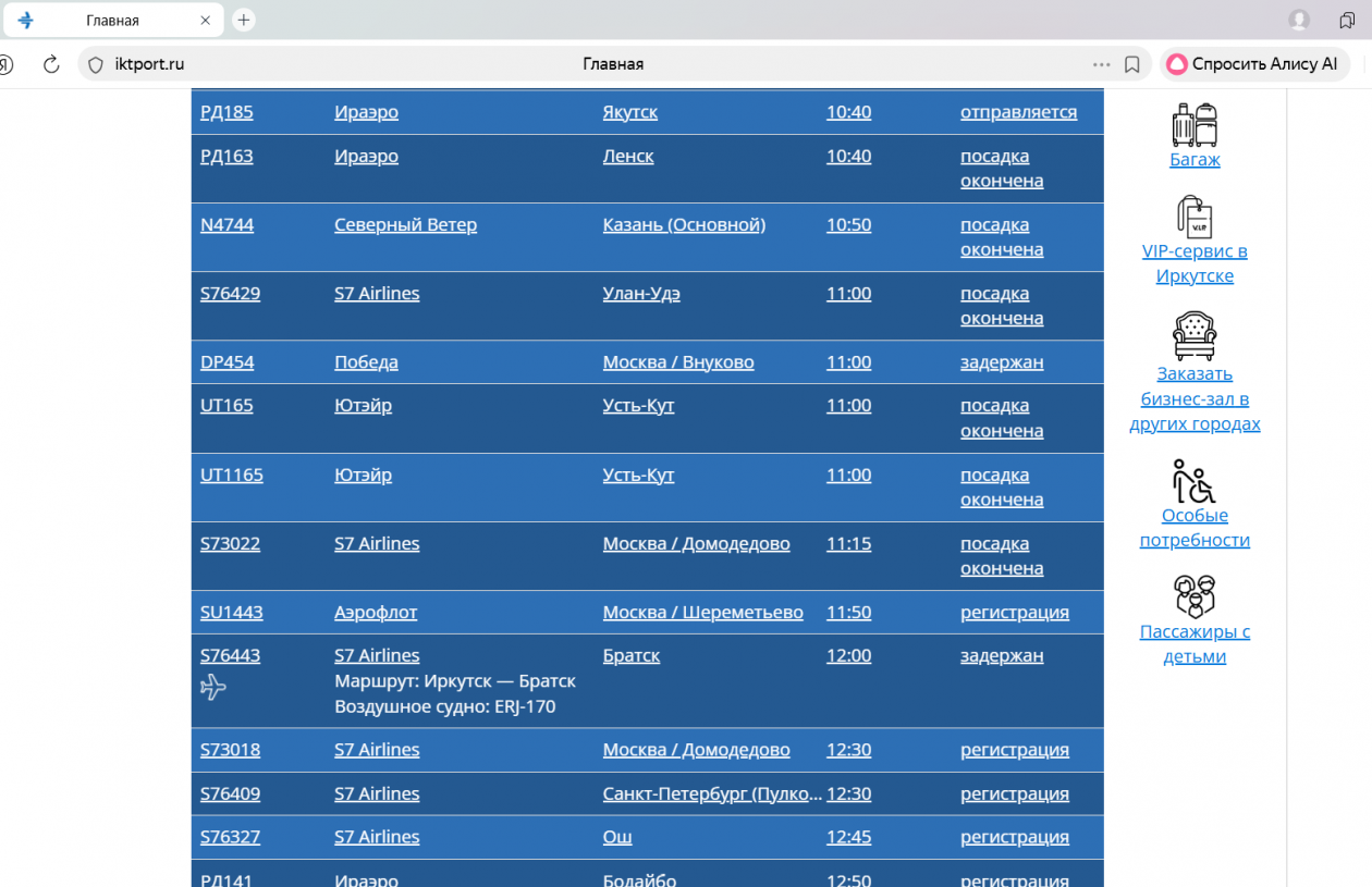 Ранее агентство сообщало, что в аэропорту Братска задерживается рейс из Иркутска из-за неблагоприятных метеоусловий в аэропорту отправления, сообщает пресс-служба аэропорта Братска. Предварительно, время вылета рейса из Иркутска перенесли на 12.30. Аэропорт Братска рекомендует пассажирам следить за актуальной информацией об отправлении и прибытии рейсов.