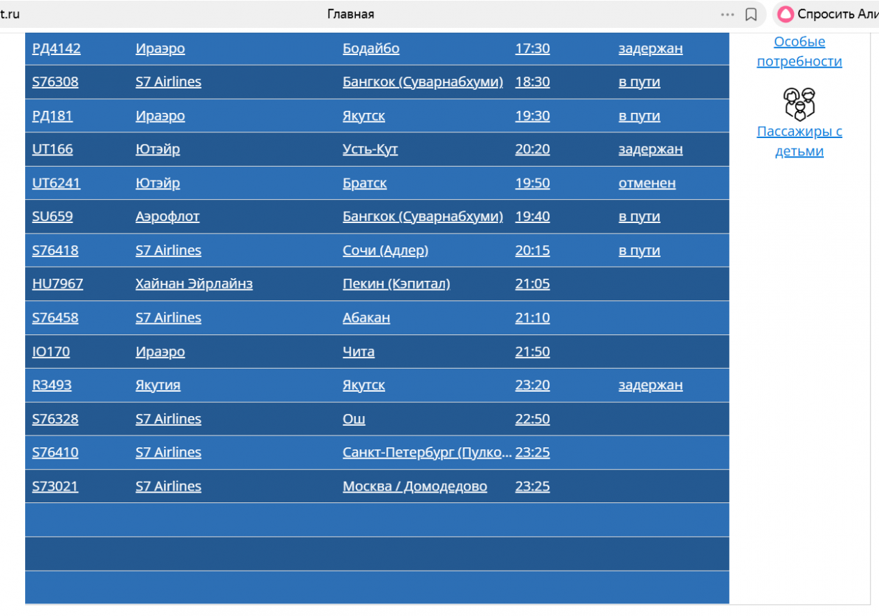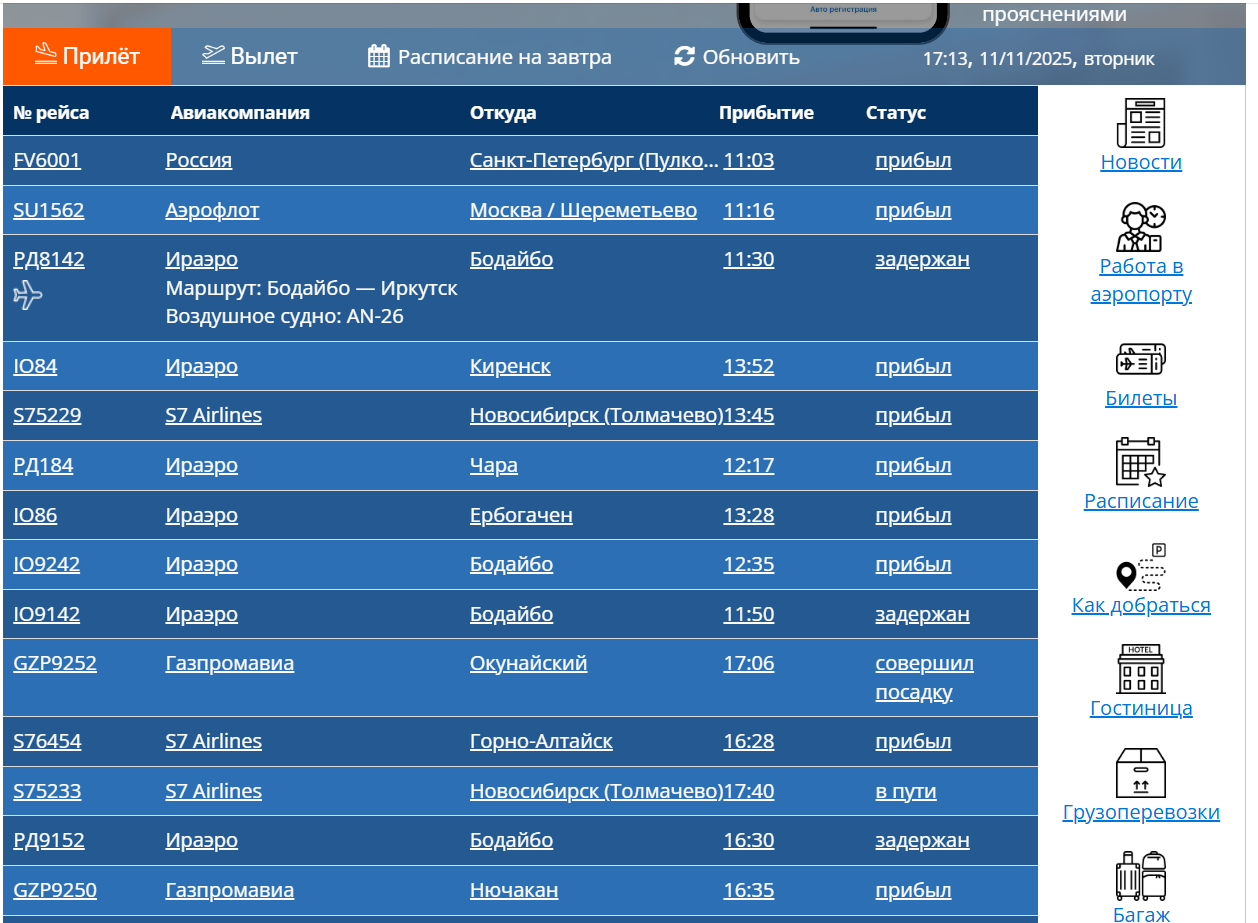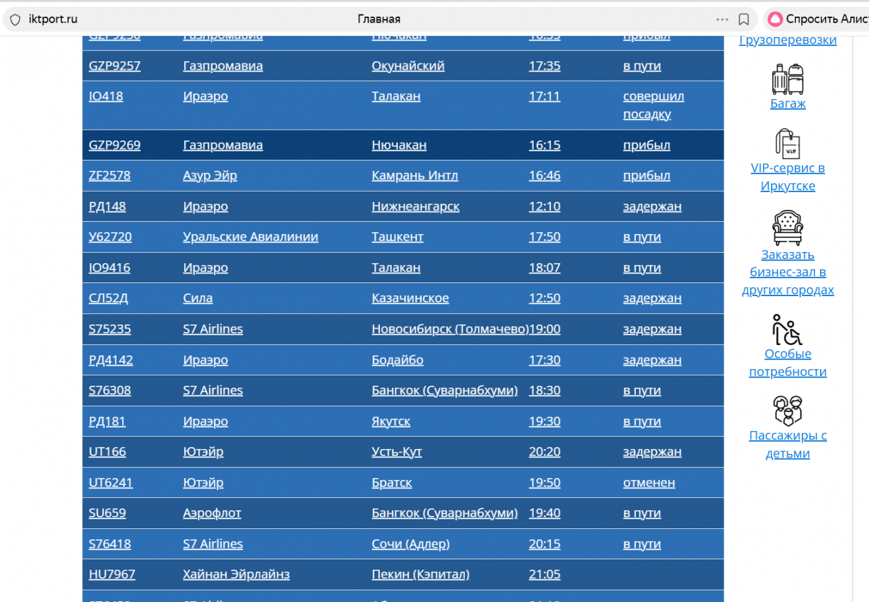 IrkutskMedia, 11 ноября. Сегодня из-за неблагоприятных погодных условий в аэропорт Иркутска с опозданием прибыло девять рейсов. Самолёты задержались из Бодайбо, Нижнеангарска, Казачинского, Новосибирска, Усть-Кута и Якутска.