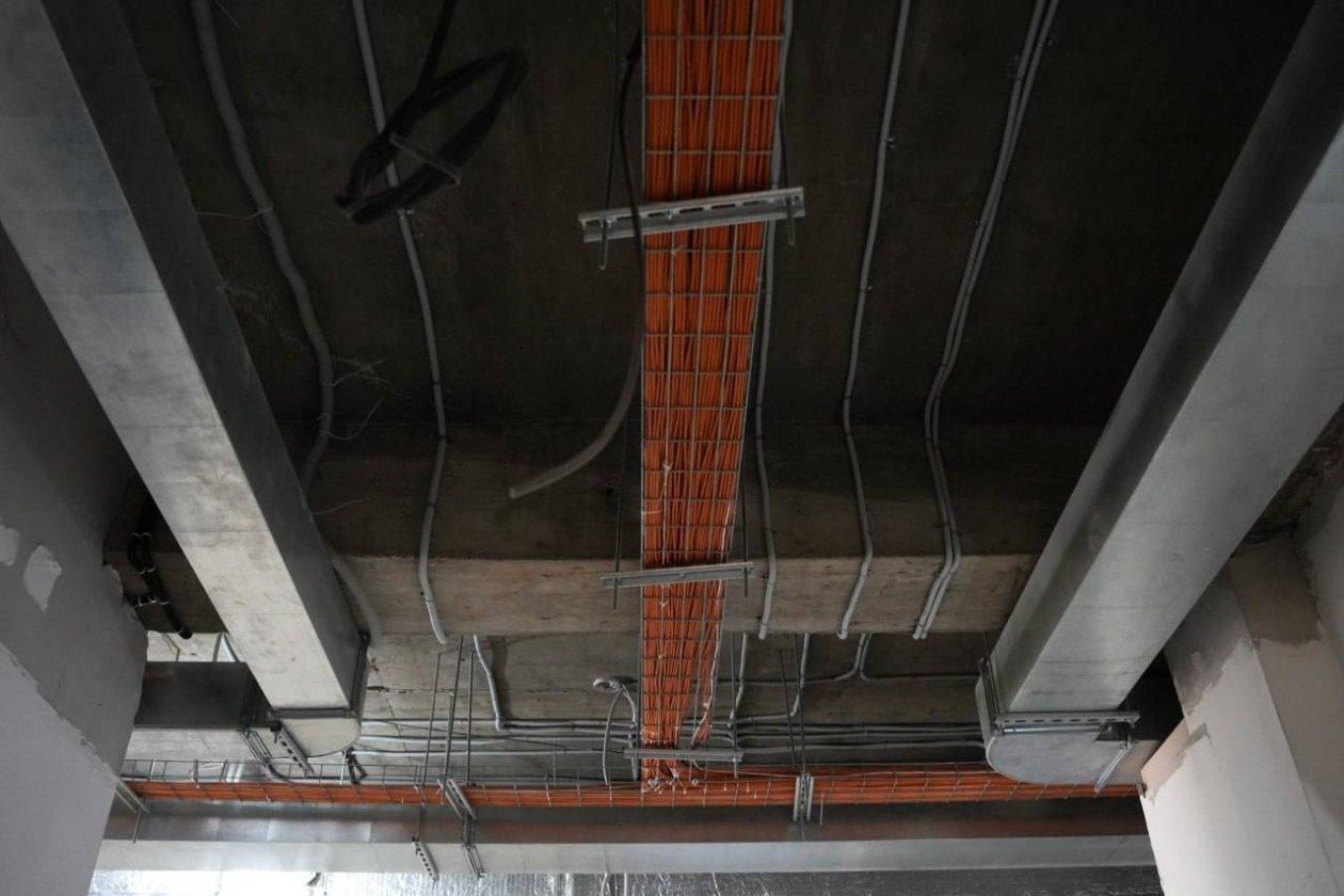 Подрядчик уже выполнил значительный объем строительно-монтажных и отделочных работ. Рабочие завершили устройство железобетонного каркаса, кровли, кирпичных перегородок, кладку наружных стен, монтаж окон и фасадной системы. Здание полностью утеплили, выполнили гидроизоляцию наружных стен. Также строители завершили монтаж систем отопления, теплового пункта и наружной канализации.