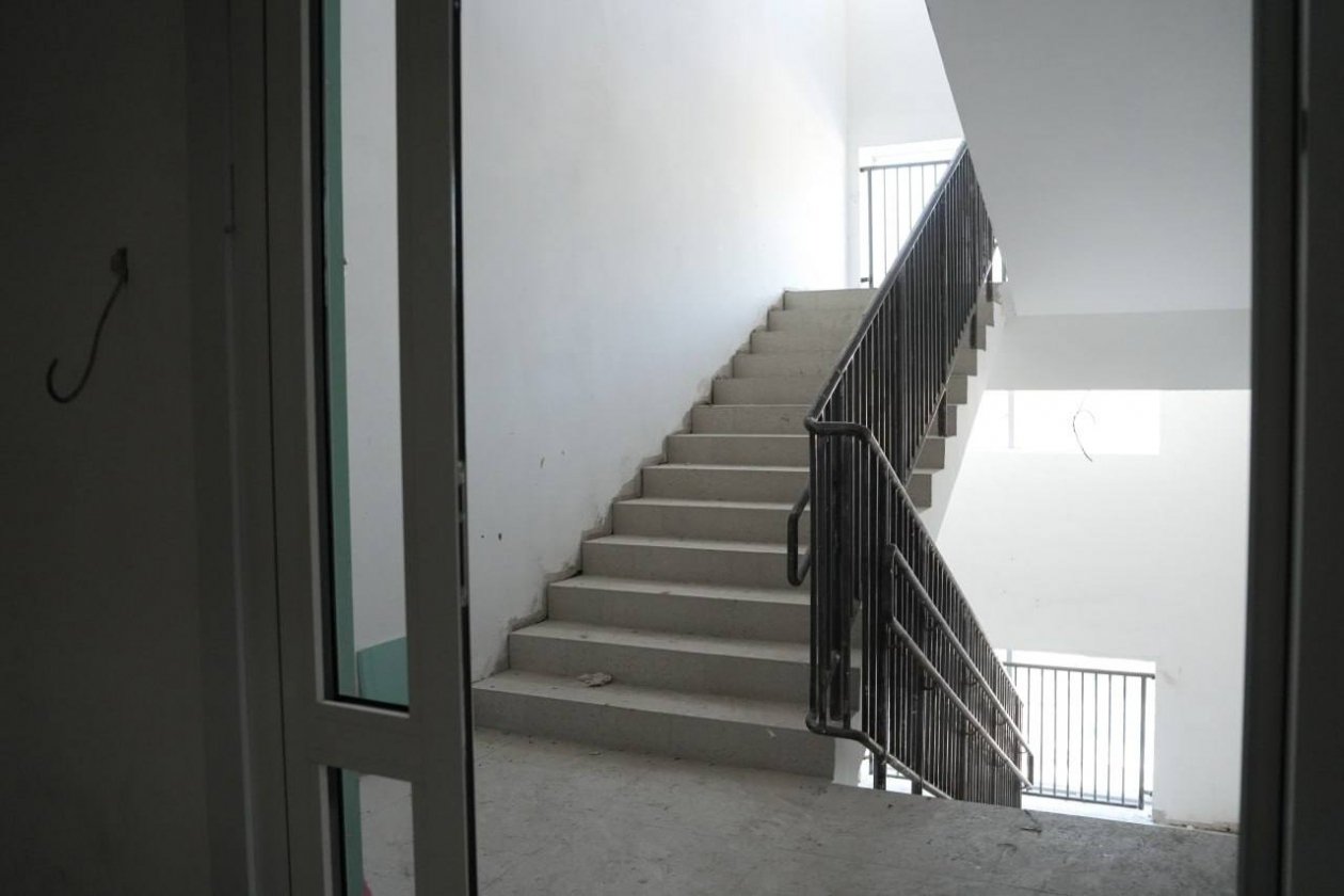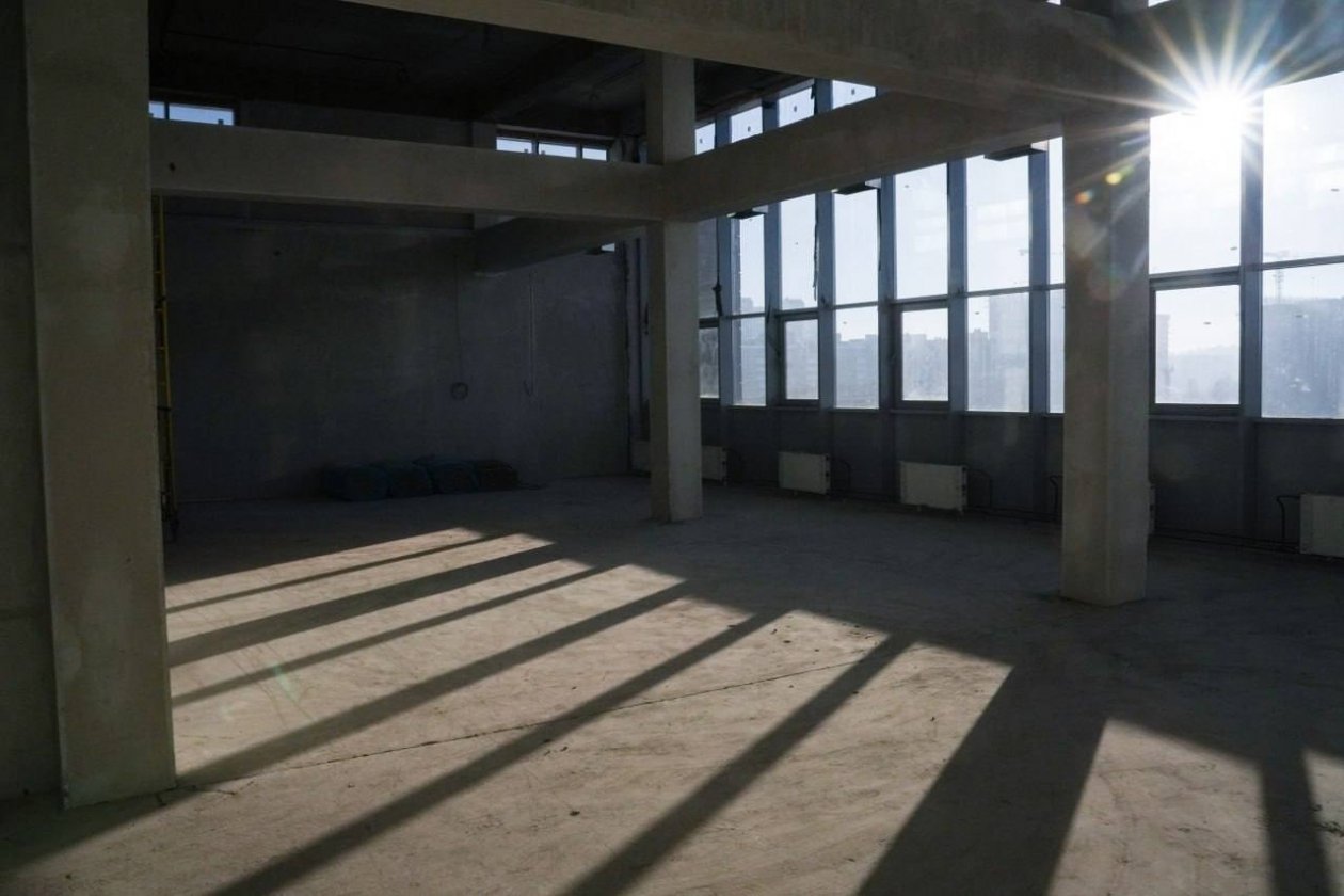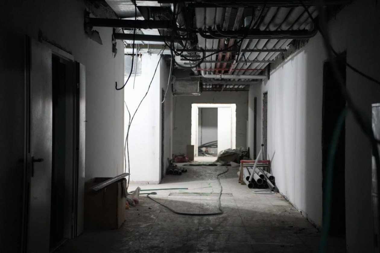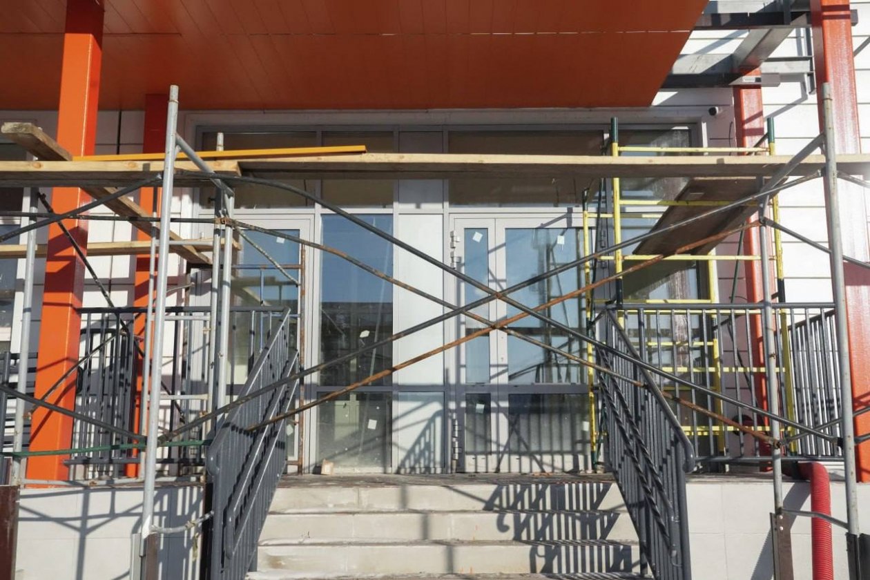 В здании в настоящее время рабочие выполняют внутренние отделочные работы: устанавливают перегородки, укладывают напольную плитку в коридорах, монтируют входные группы. На 60% завершена базовая шпатлевка стен. Параллельно строители монтируют подвесные потолки, устанавливают двери, а также благоустраивают территорию, возводят ограждение.