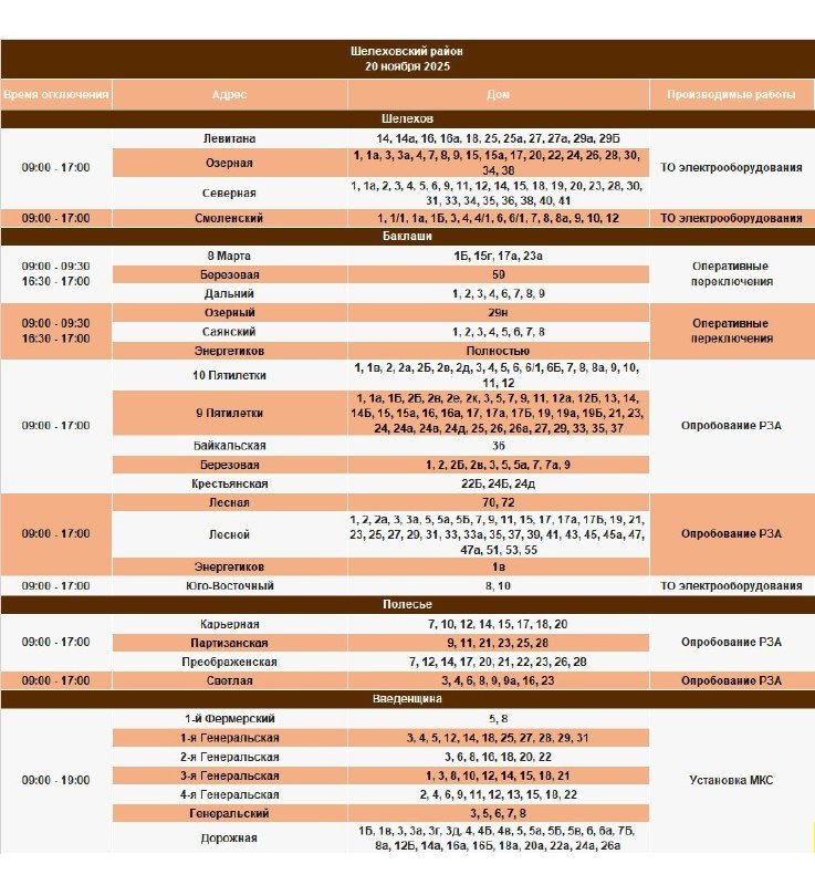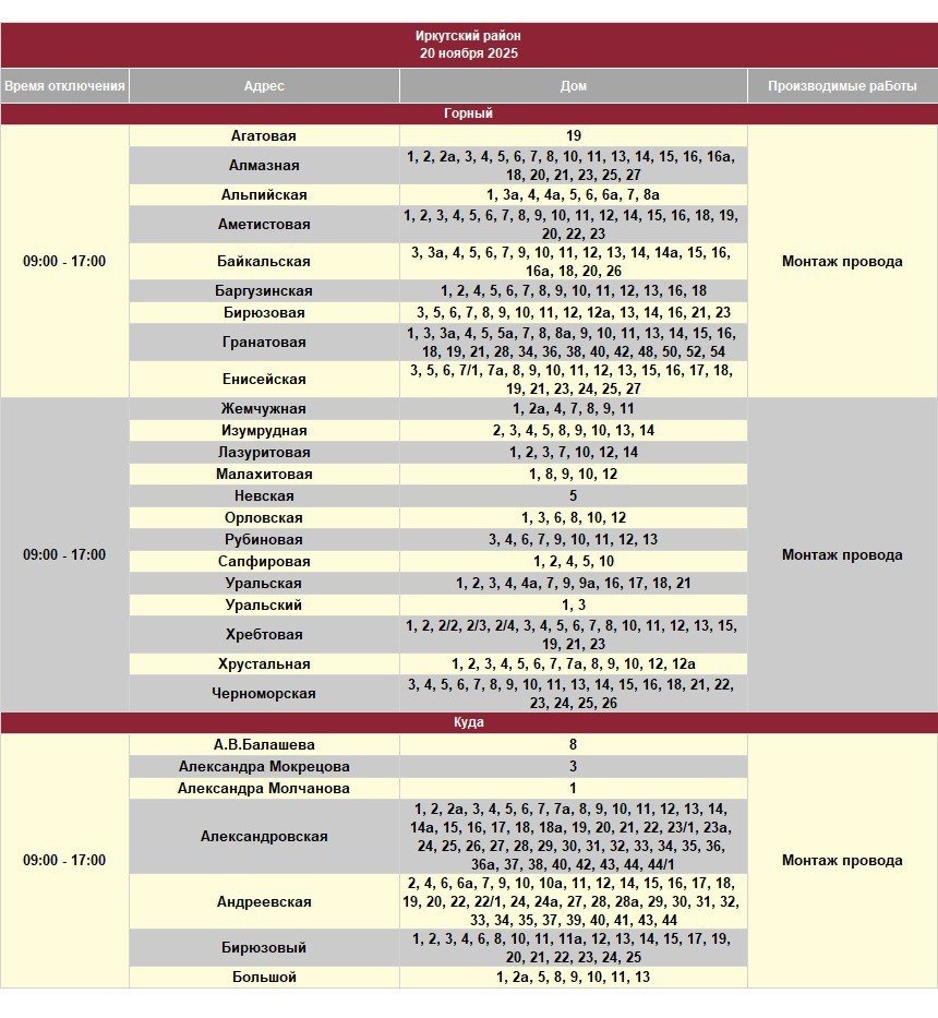 IrkutskMedia, 19 ноября. 12 ноября в некоторых населенных пунктах Иркутской области будет временно ограничено электроснабжение. В тг-канале (18+) "СВЕТ38" сообщается, что меры будут приняты в связи с проведением неотложных работ на электросетях.