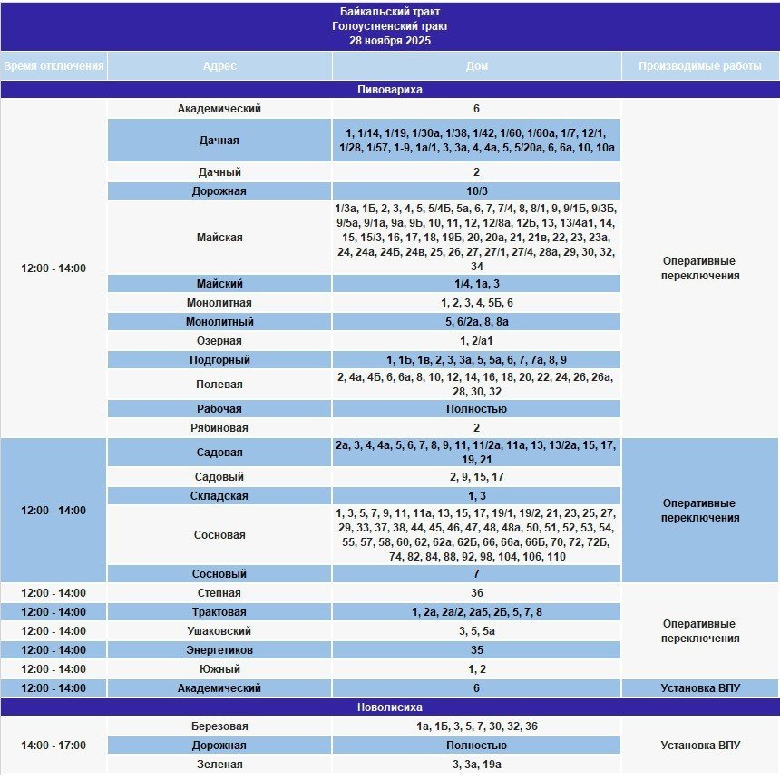 IrkutskMedia, 27 ноября. 28 ноября в некоторых населенных пунктах Иркутской области будет временно ограничено электроснабжение. В телеграм-канале (18+) "СВЕТ38" сообщается, что меры будут приняты в связи с проведением неотложных работ на электросетях.