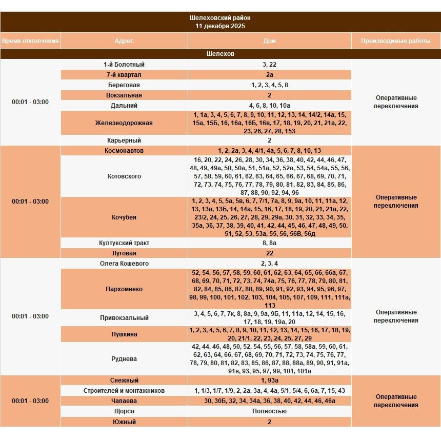 IrkutskMedia, 10 декабря. В связи с проведением неотложных работ на электросетях 11 декабря будет ограничено электроснабжение в некоторых населенных пунктах Приангарья. В телеграм-канале "СВЕТ38" (18+) сообщается, что под отключение попадут некоторые дома в Иркутске, Шелеховском районе и в населенных пунктах, расположенных по Байкальскому и Плишкинскому трактам.