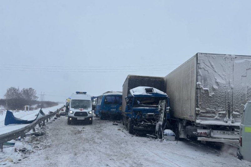 В Telegram-канале (18+) МВД Омской области сообщили, что авария произошла на автодороге Тюмень-Омск. По предварительной версии, водитель грузового автомобиля "Вольво" выехал на встречную полосу где столкнулся с автобусом ПАЗ, выполнявшим рейс по маршруту "Омск-Крутинка". Также столкнулись автомобиль "Тойота" и два КамАЗа.