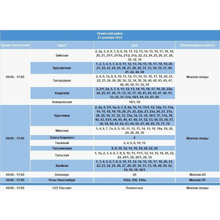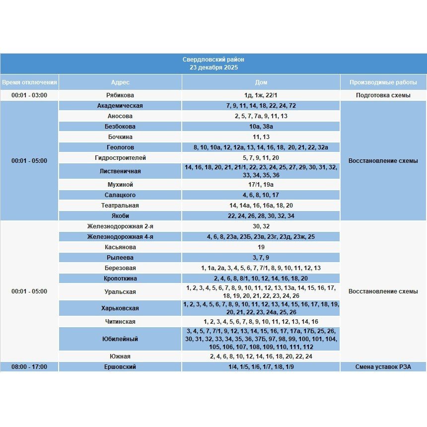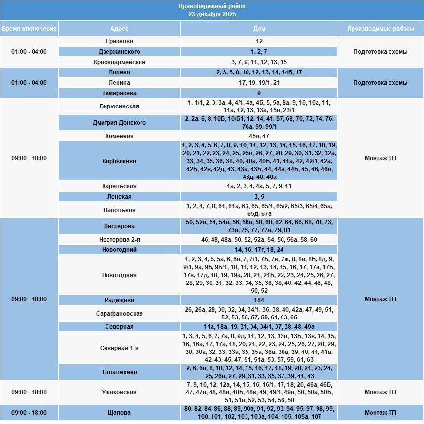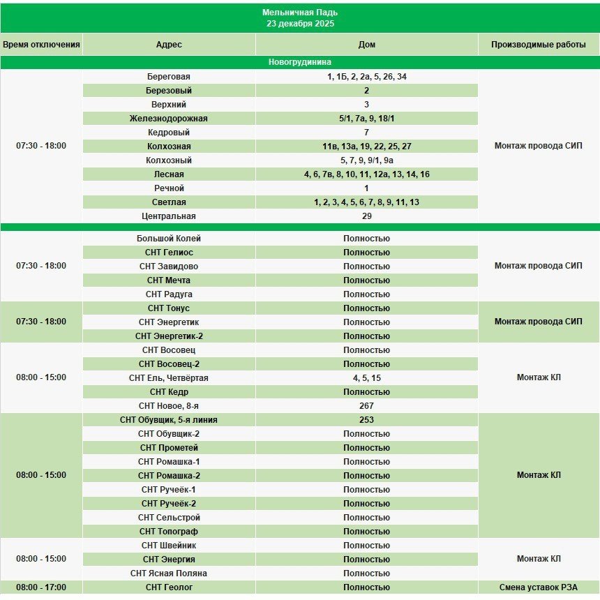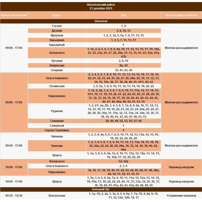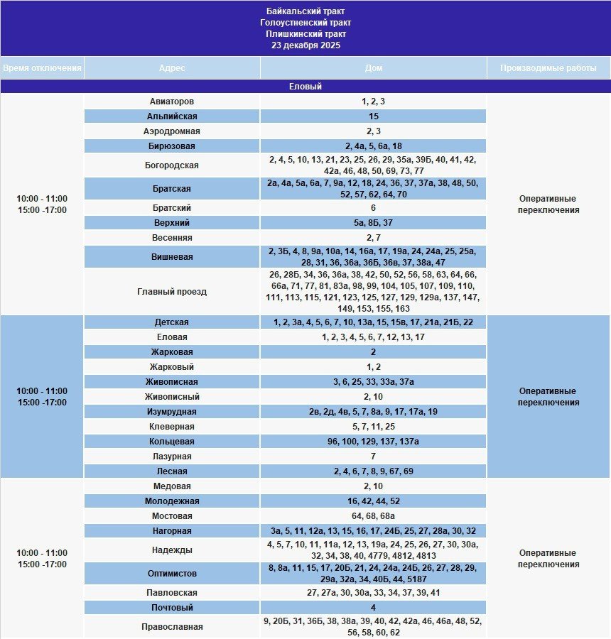 IrkutskMedia, 22 декабря 2025. 23 декабря в некоторых населенных пунктах Иркутской области будет временно ограничено электроснабжение. В тг-канале (18+) "СВЕТ38" сообщается, что меры будут приняты в связи с проведением неотложных работ на электросетях.