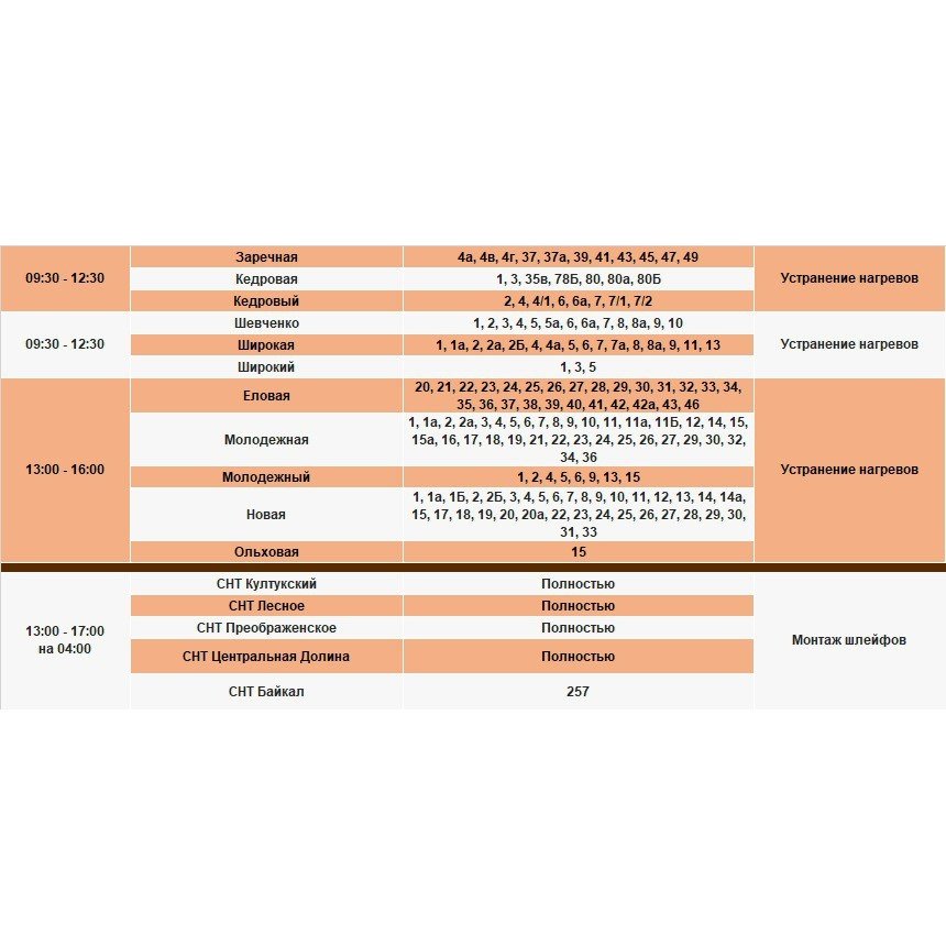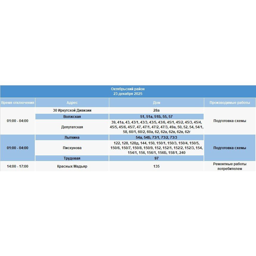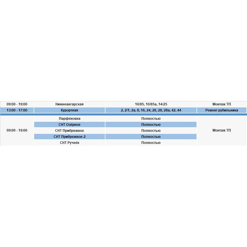 Под отключение попадут часть домов в Иркутске, в Шелеховском районе, населенных пунктах по по Байкальскому, Голоустненскому и Плишкинскому трактам, в посёлке Мельничная Падь.