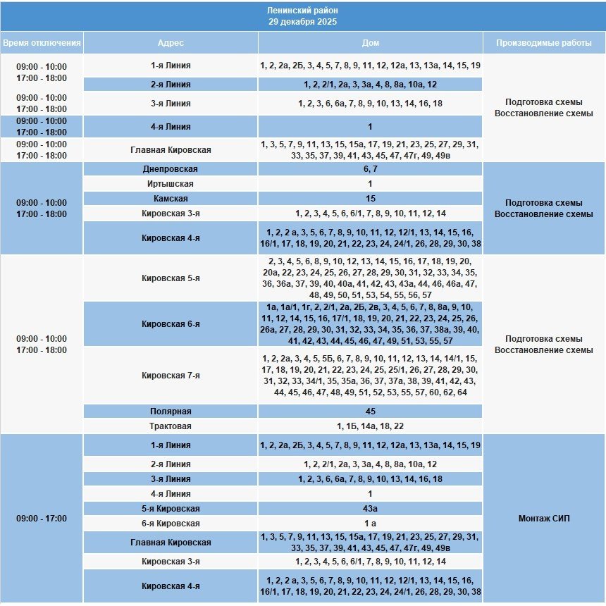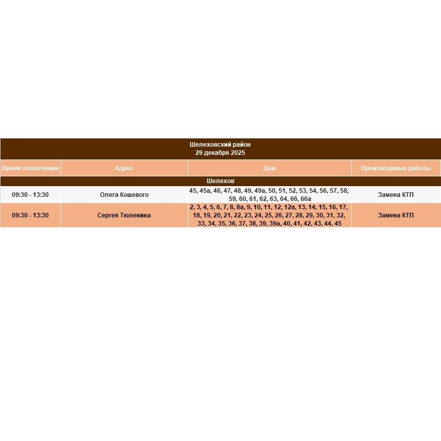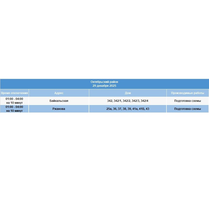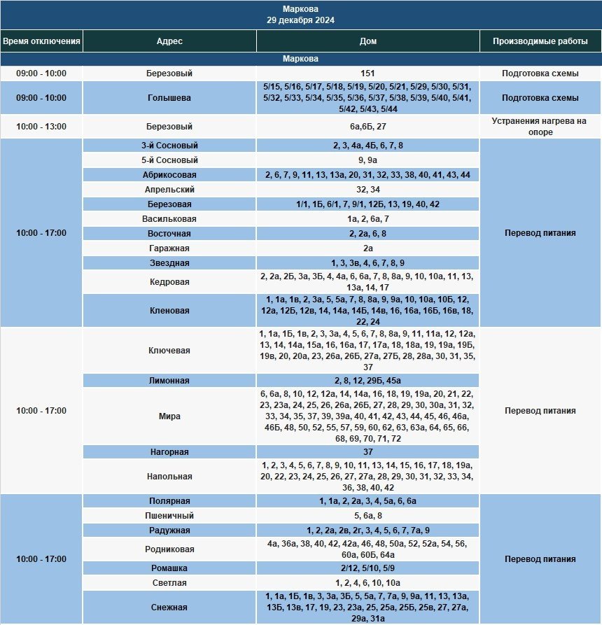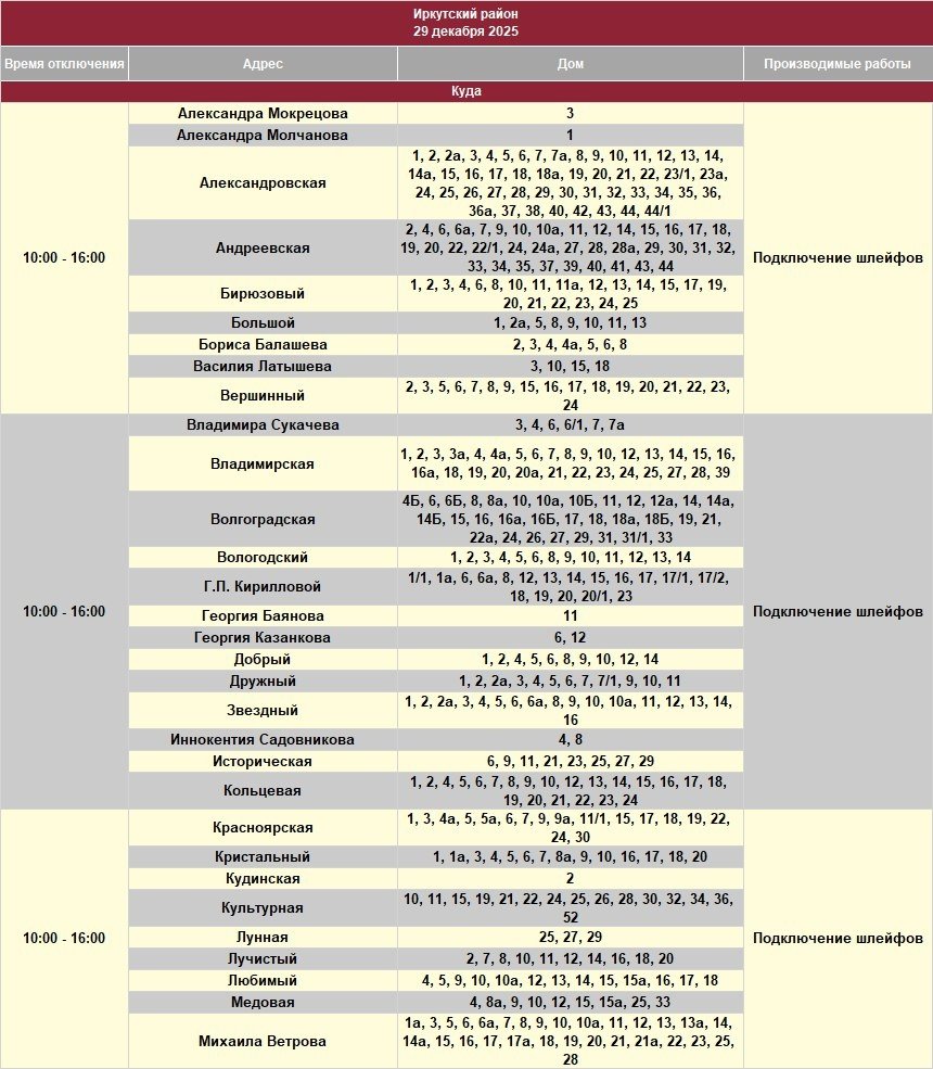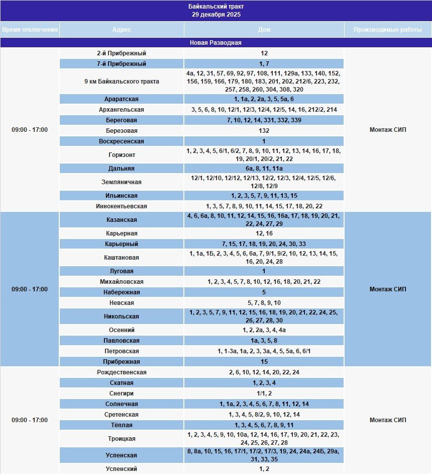 IrkutskMedia, 28 декабря 2025. 29 декабря в некоторых населённых пунктах Иркутской области временно ограничат электроснабжение. В тг-канале "СВЕТ38" (18+) сообщается, что меры примут в связи с проведением неотложных работ на электросетях.