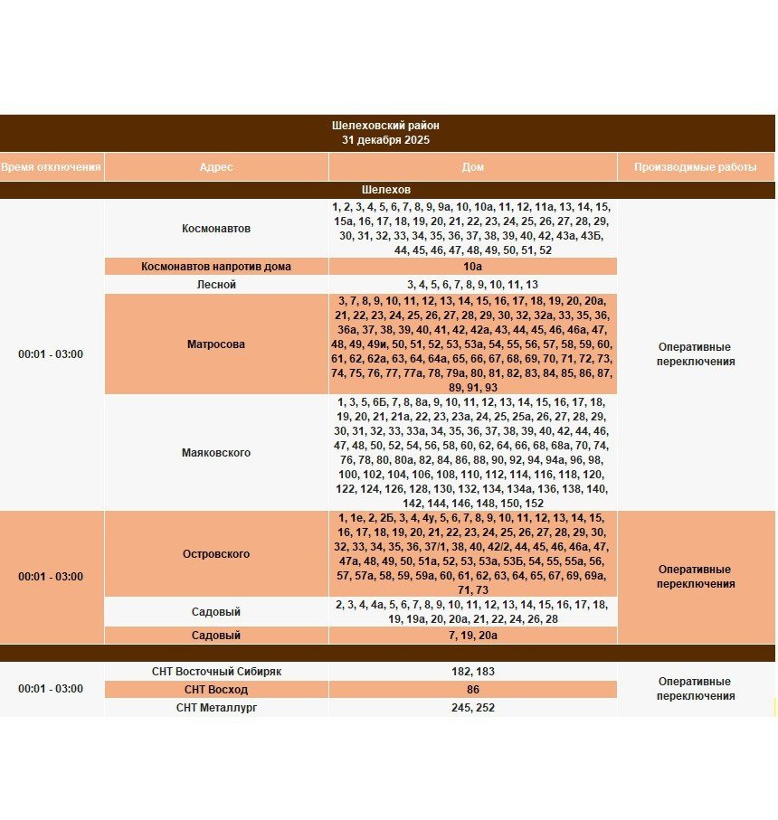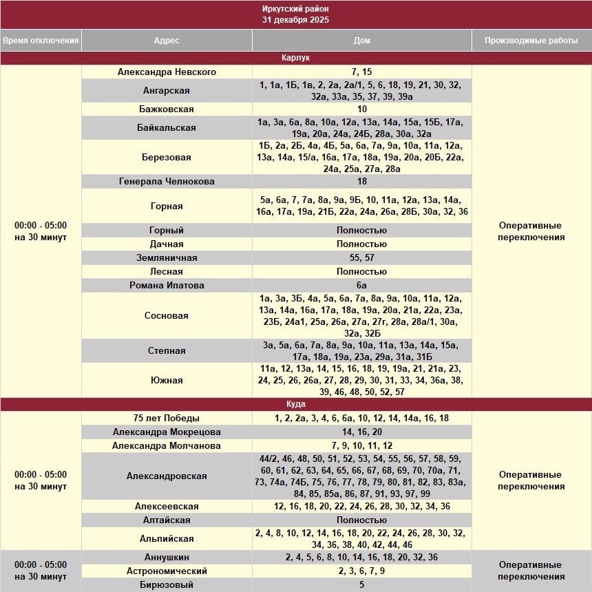 IrkutskMedia, 30 декабря 2025. 30 декабря в некоторых населенных пунктах Иркутской области будет временно ограничено электроснабжение. В тг-канале (18+) "СВЕТ38" сообщается, что меры будут приняты в связи с проведением неотложных работ на электросетях.
