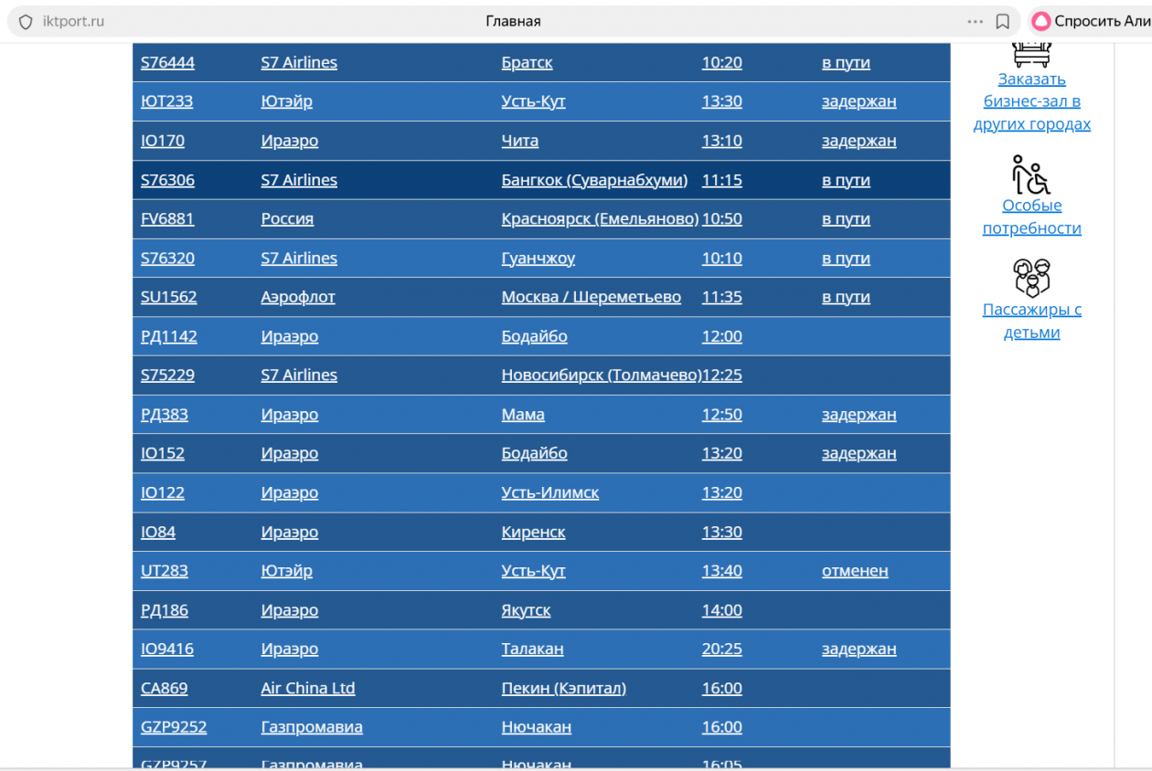 Из Иркутска вылетят позже самолёты в Усть-Кут, Фукуок, Читу, в Санкт-Петербург, Талакан. Отменен один рейс в Усть-Кут.