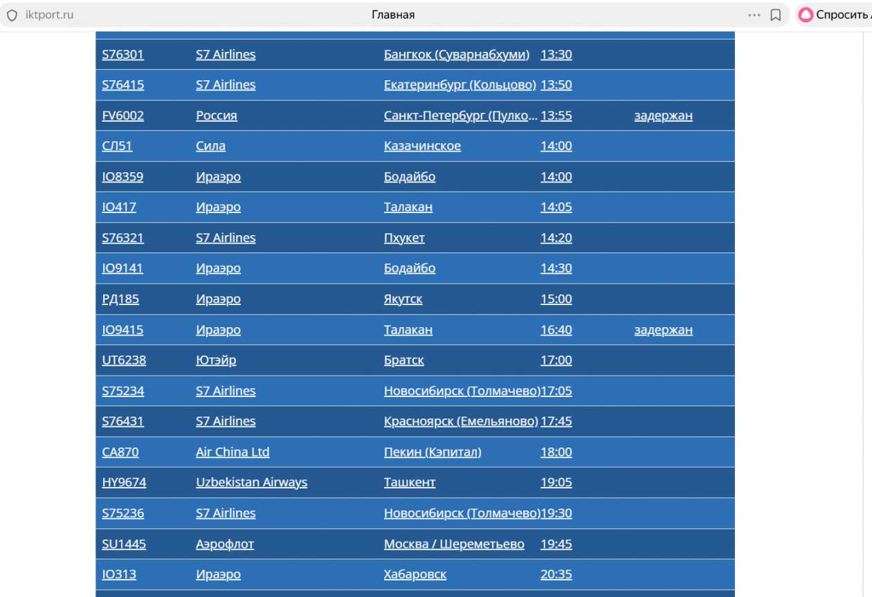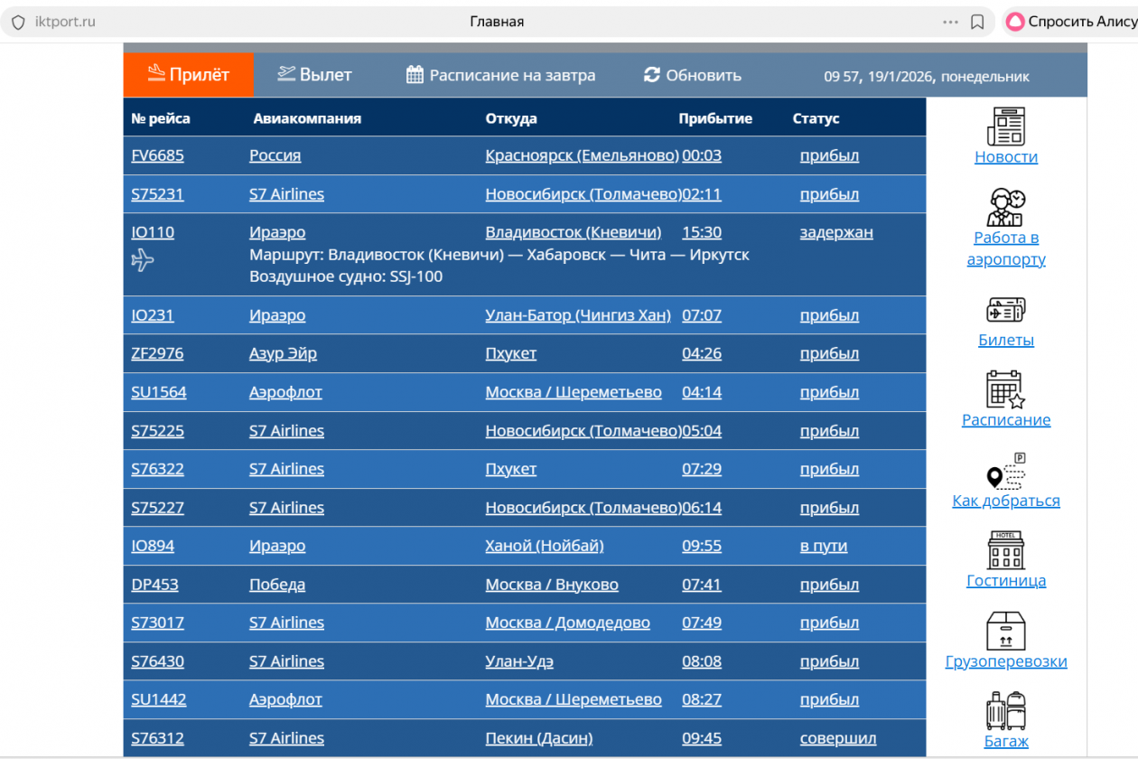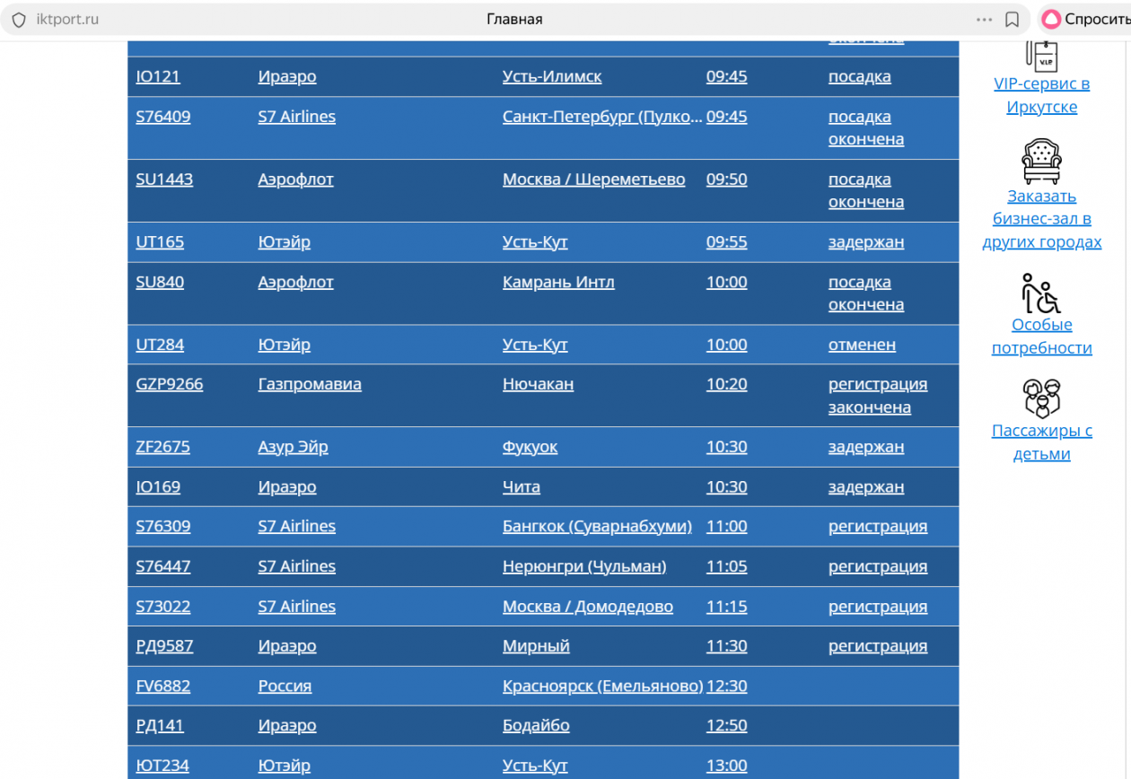 Из Иркутска вылетят позже самолёты в Усть-Кут, Фукуок, Читу, в Санкт-Петербург, Талакан. Отменен один рейс в Усть-Кут.