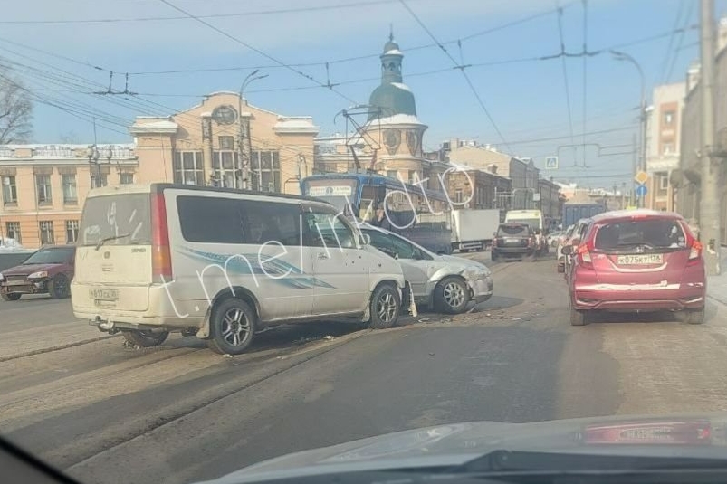 Две иномарки столкнулись на трамвайных путях в центре Иркутска