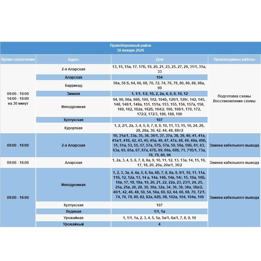 В Кировском и Куйбышевском районах подготовка и восстановление схемы, а также замена кабельного выхода с 9.00 до 16.00.