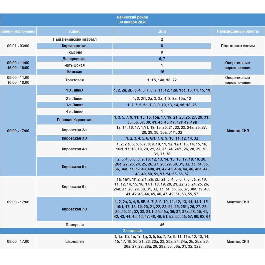 В Ленинском районе будут проводиться подготовка схемы, оперативные переключения, монтаж СИП с 00.01 до 17.00.