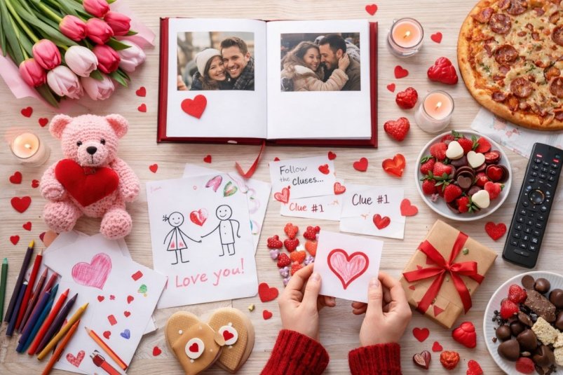Для любителей сюрпризов подойдёт романтический квест по квартире. Карточки с заданиями и подсказками, спрятанные в разных местах, можно дополнить наградами — от конфет до финального подарка. Игра добавляет динамики и превращает вечер в событие.