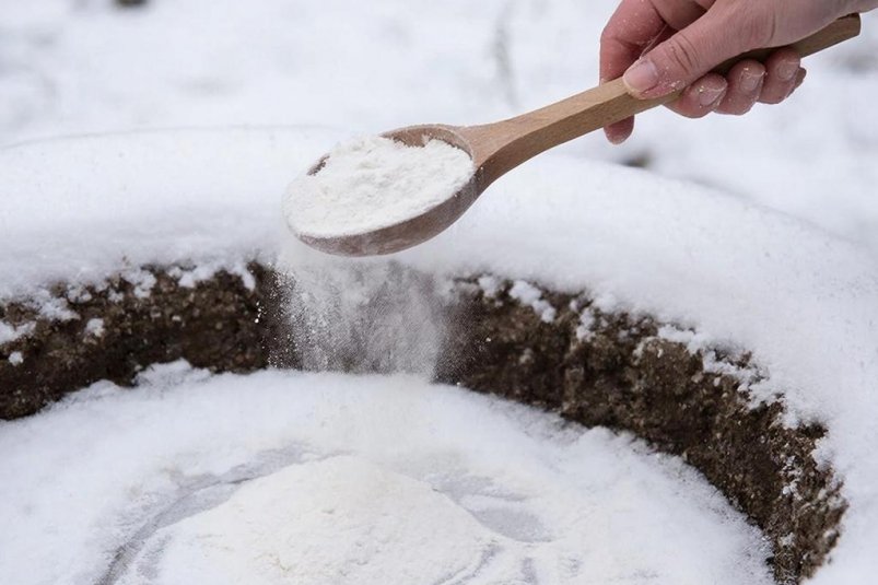 Идеальное время — конец зимы или ранняя весна, когда на земле ещё лежит снег, а до посадок остаётся несколько недель. Мука успеет насытить почву.