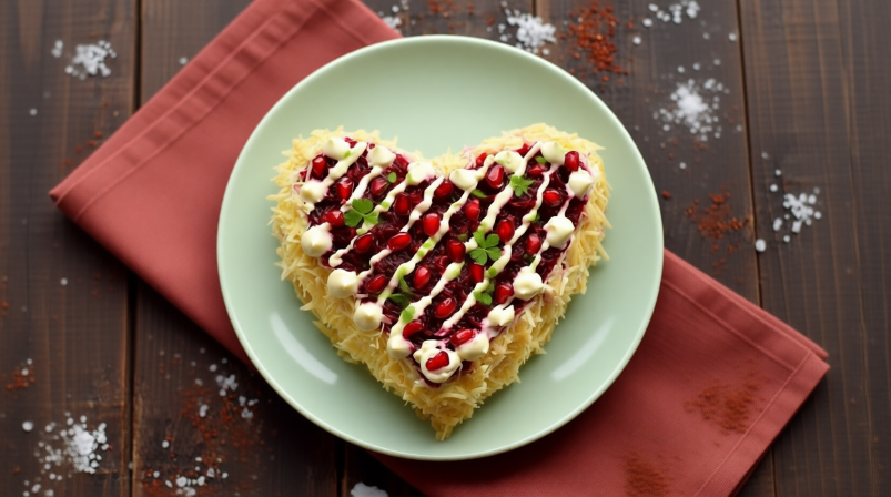 Веоиколепный по внешнему виду, изумительный и воздушный салат в форме сердца. Это блюдо точно удивит и порадует вашу вторую половинку 14 февраля. Все ингредиенты тщательно подобраны, чтобы создать гармоничный вкусовой букет.