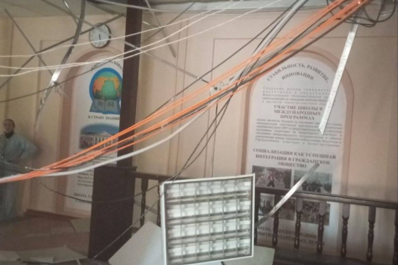 IrkutskMedia, 12 февраля. Обрушение штукатурки с потолка размером 1,5м на 2м произошло в школе №64 в Иркутске накануне, 11 февраля, в 18.10. В момент обрушения детей не было на этаже, никто не пострадал.