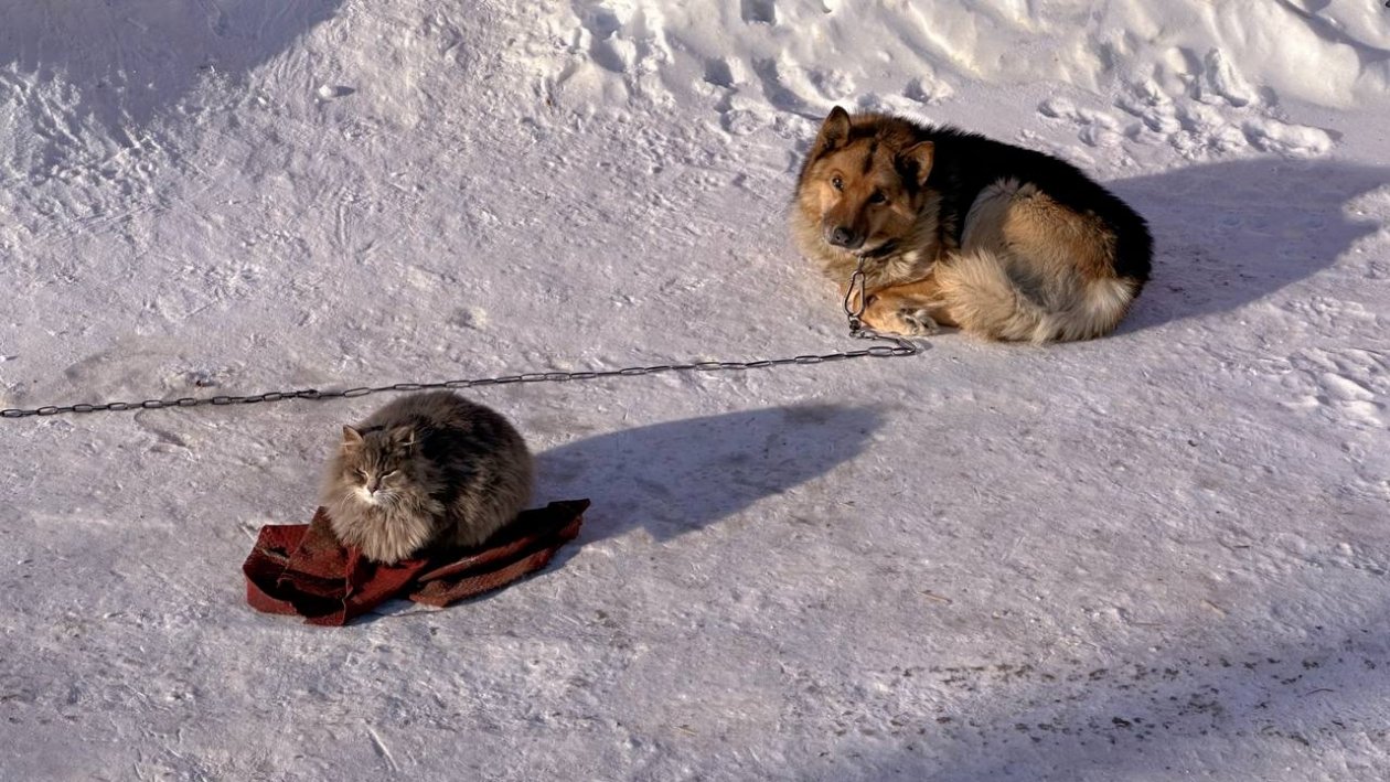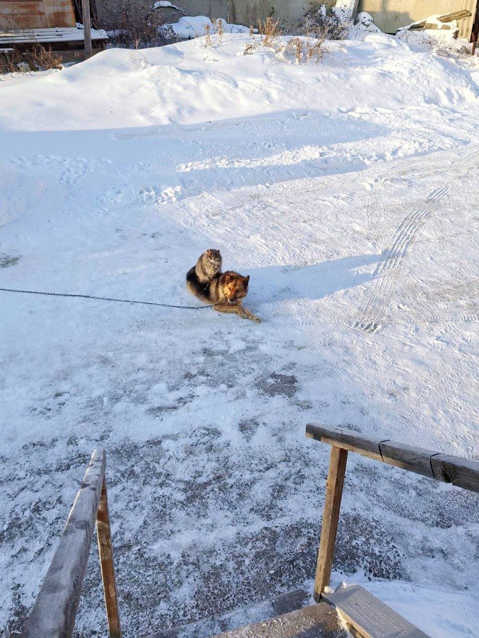 IrkutskMedia, 12 февраля. Эта добрая история о настоящей дружбе тронула сердца иркутян в морозном январе. В социальных сетях появились фотографии, где кошка и собака, живущие на одной из городских автостоянок, греют друг друга в холода. Кошечка садилась псу на спину или забиралась к нему в будку, и вместе они коротали студеные дни. Наша редакция не смогла остаться равнодушной — мы разыскали автостоянку и подробно узнали историю двух четвероногих друзей.