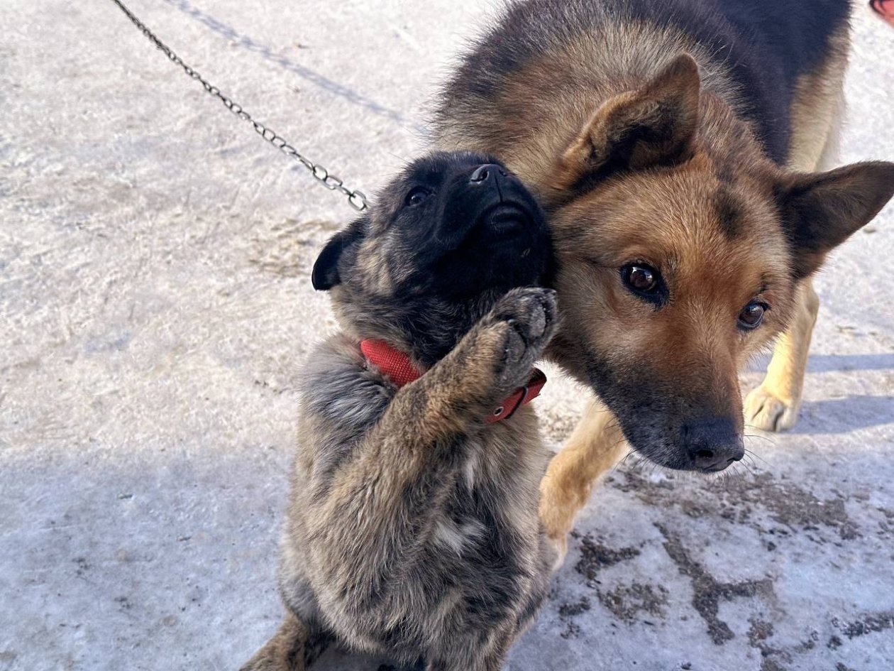 Маня постоянно взбирается на Дружка верхом, а он и ухом не ведет. Спят тоже вместе — в будке, но уже втроем — на территории живет щенок Пулька от еще одной собаки. И его эти товарищи привечают в теплой будке.
