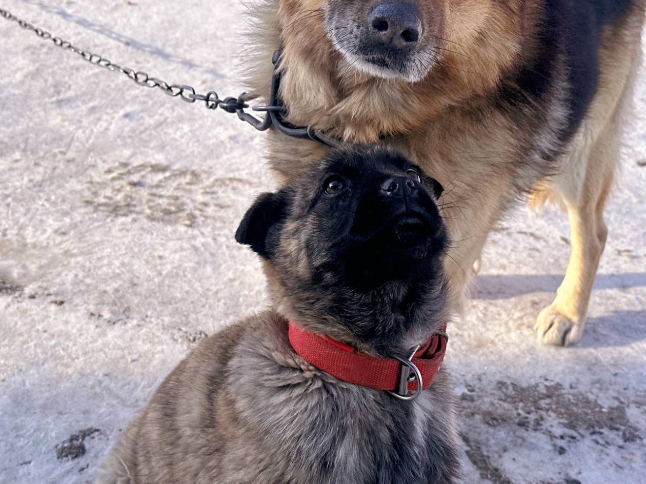 Маня постоянно взбирается на Дружка верхом, а он и ухом не ведет. Спят тоже вместе — в будке, но уже втроем — на территории живет щенок Пулька от еще одной собаки. И его эти товарищи привечают в теплой будке.
