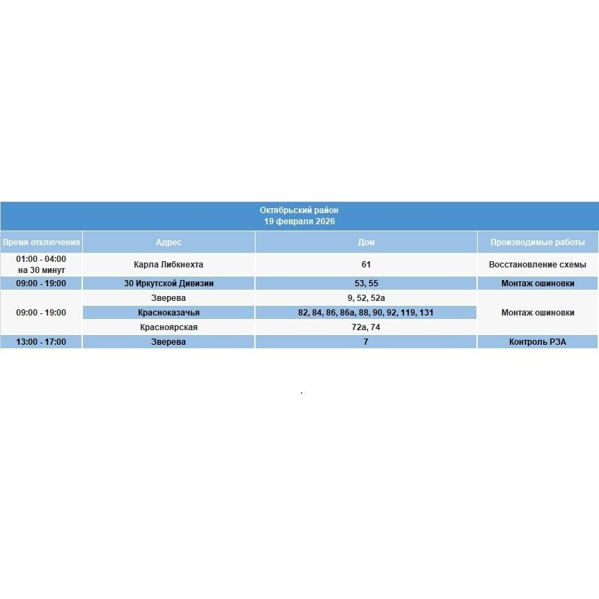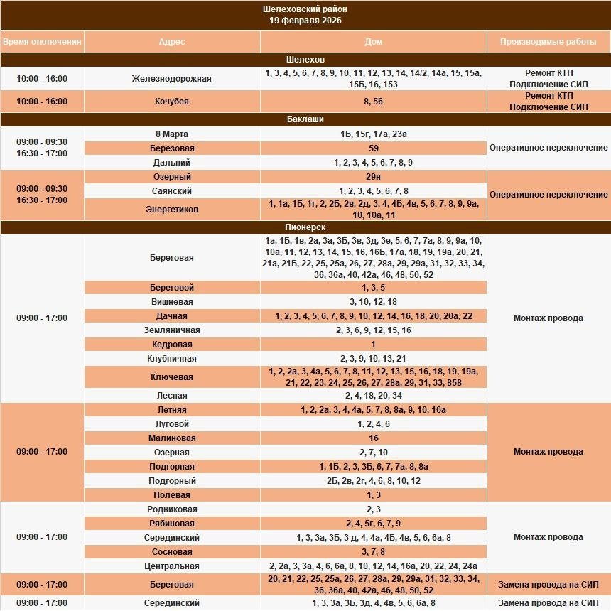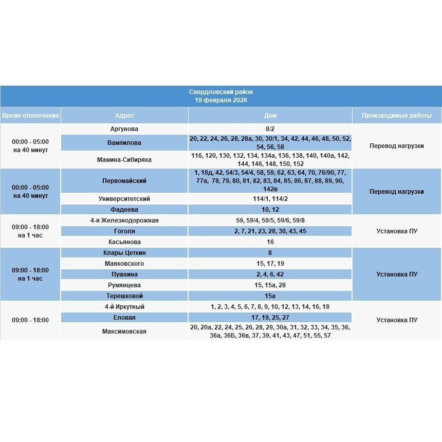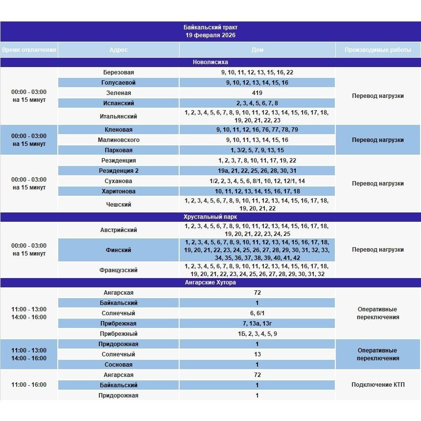 IrkutskMedia, 18 февраля. В части домов Иркутска и района, а также некоторых населенных пунктов Шелеховского района 19 февраля будет ограничено электроснабжение. В тг-канале "СВЕТ38" (18+) сообщается, что специалисты проведут неотложные работы на электросетях.
