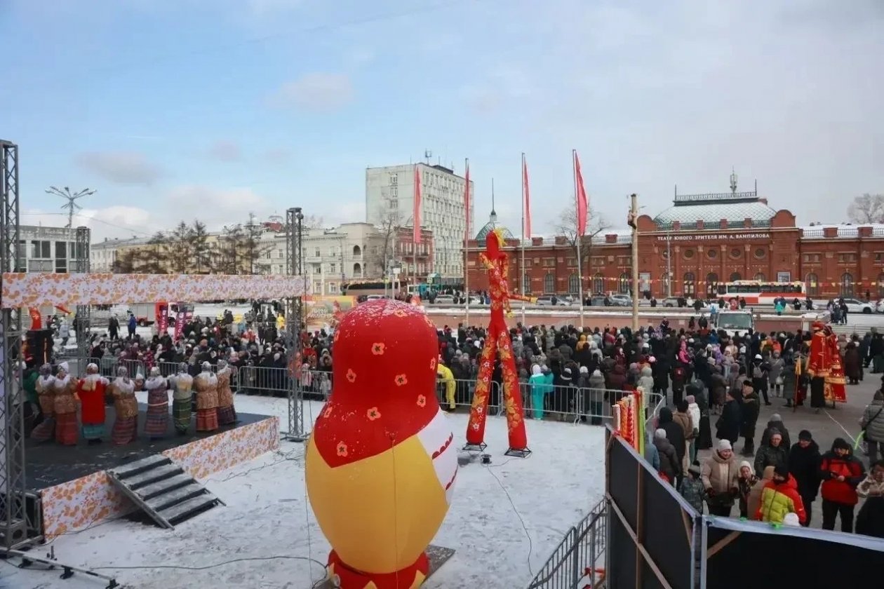 Масленичные гуляния проходят у стадиона "Труд" в Иркутске Праздник собрал семьи, творческие коллективы города и гостей на площади у Дворца спорта