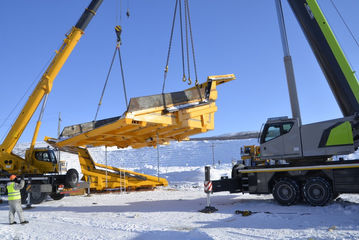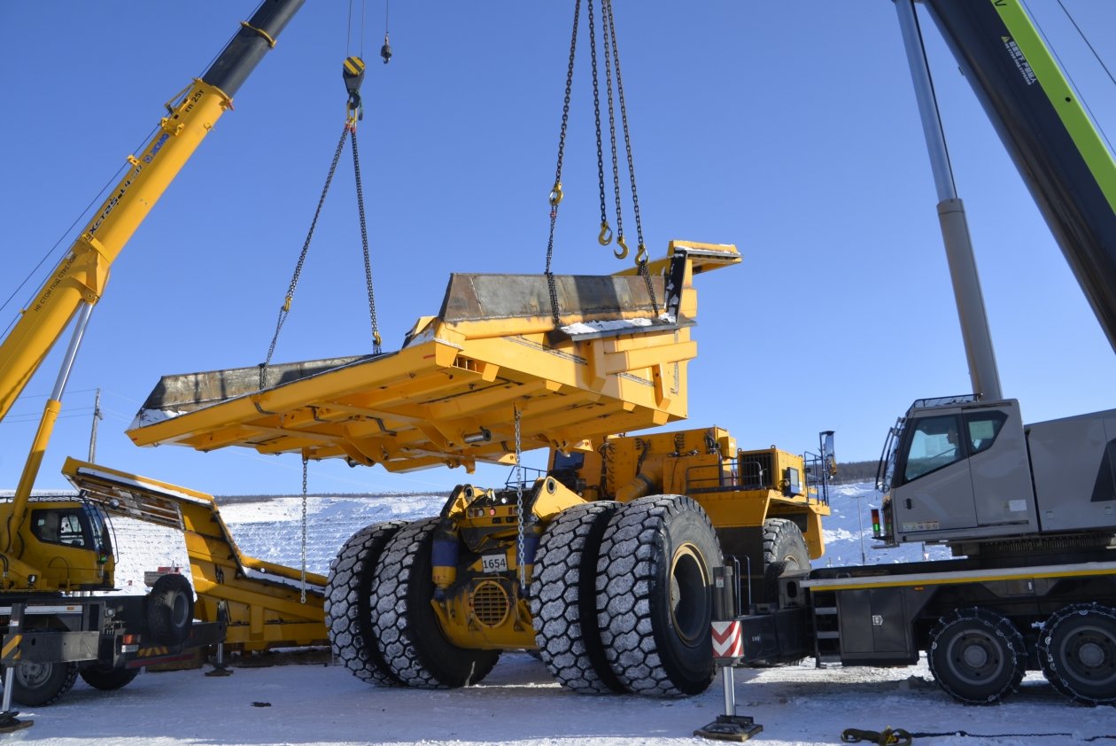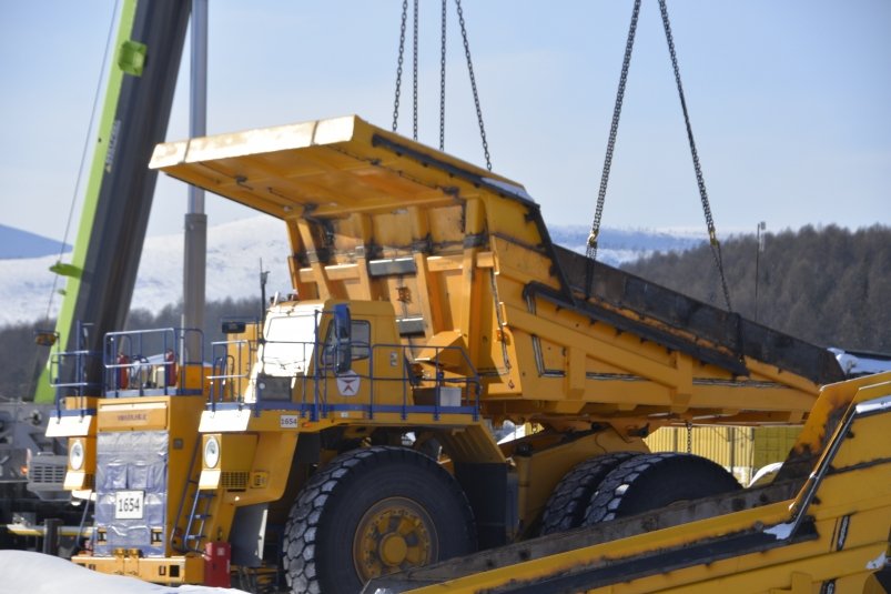 С помощью двух мощных кранов кузова устанавливаются на самосвал. Всё. Техника готова к эксплуатации. Этот и другие белорусские многотонники пополнят парк большегрузной техники, который задействован на опытно-промышленной разработке одного из крупнейших золоторудных месторождений мира — Сухой Лог.