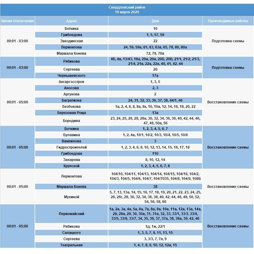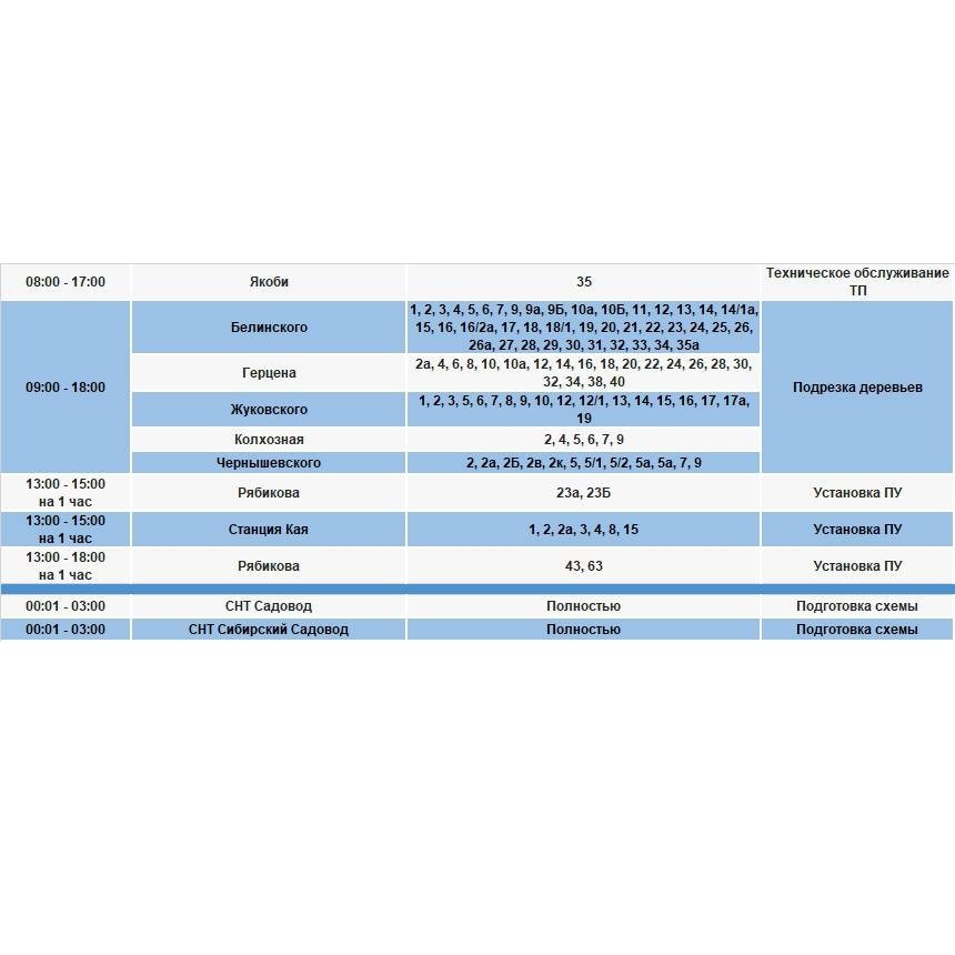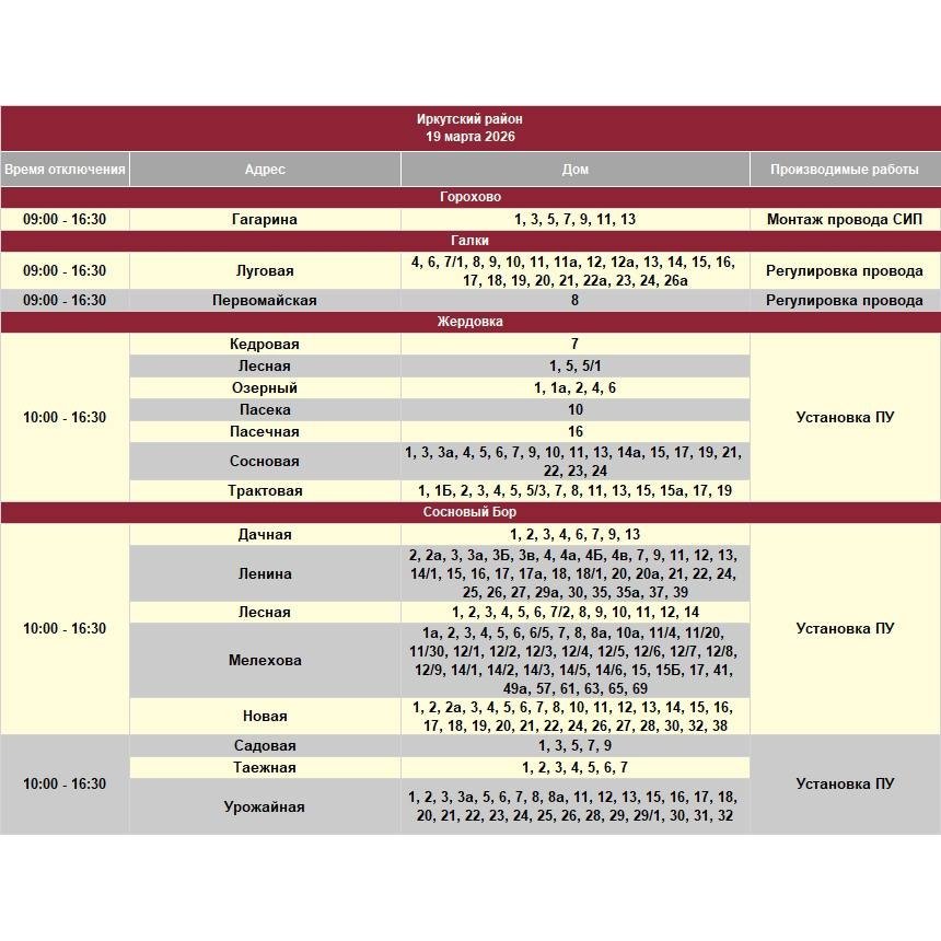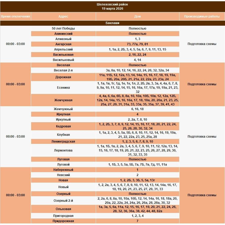 В тг-канале "СВЕТ38" (18+) сообщается, что под отключение попадут некоторые дома в Иркутском и Шелеховском районах, в Марково и Иркутске.
