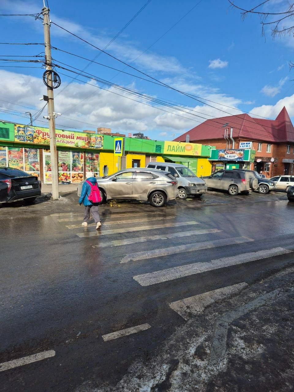 И, наконец, два случая парковки прямо на пешеходных переходах. Машины встали так, что людям приходилось буквально обходить их по дороге. Формально — нарушение правил остановки и стоянки транспортных средств, штраф — 1 тысяча рублей. Но в реальности это ещё и прямой риск: водитель теряет обзор, а пешеход — безопасность.