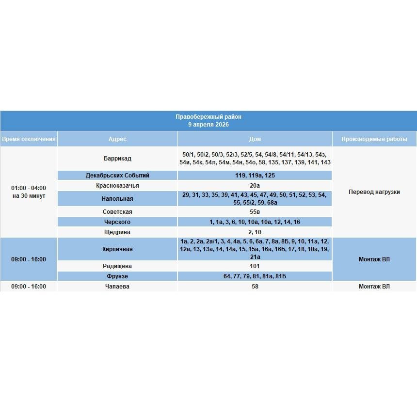 IrkutskMedia, 8 апреля. 9 апреля в некоторых домах Иркутска будет ограничено электроснабжение. Меры предпринимаются для проведения плановых работ на электрических сетях, сообщается в тг-канале "СВЕТ38" (18+).