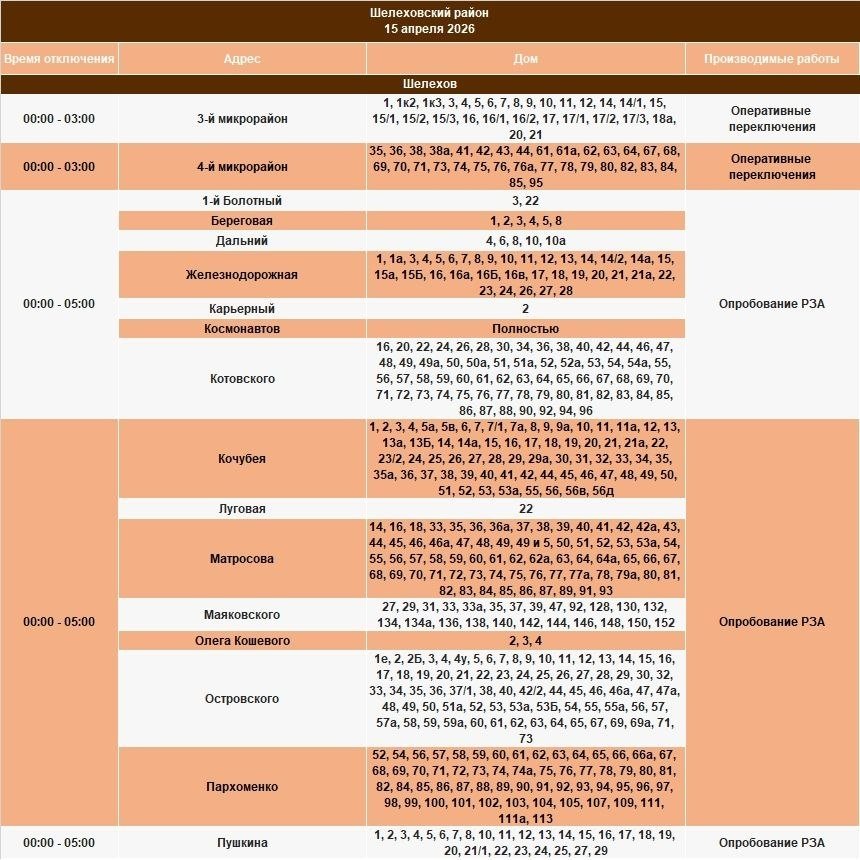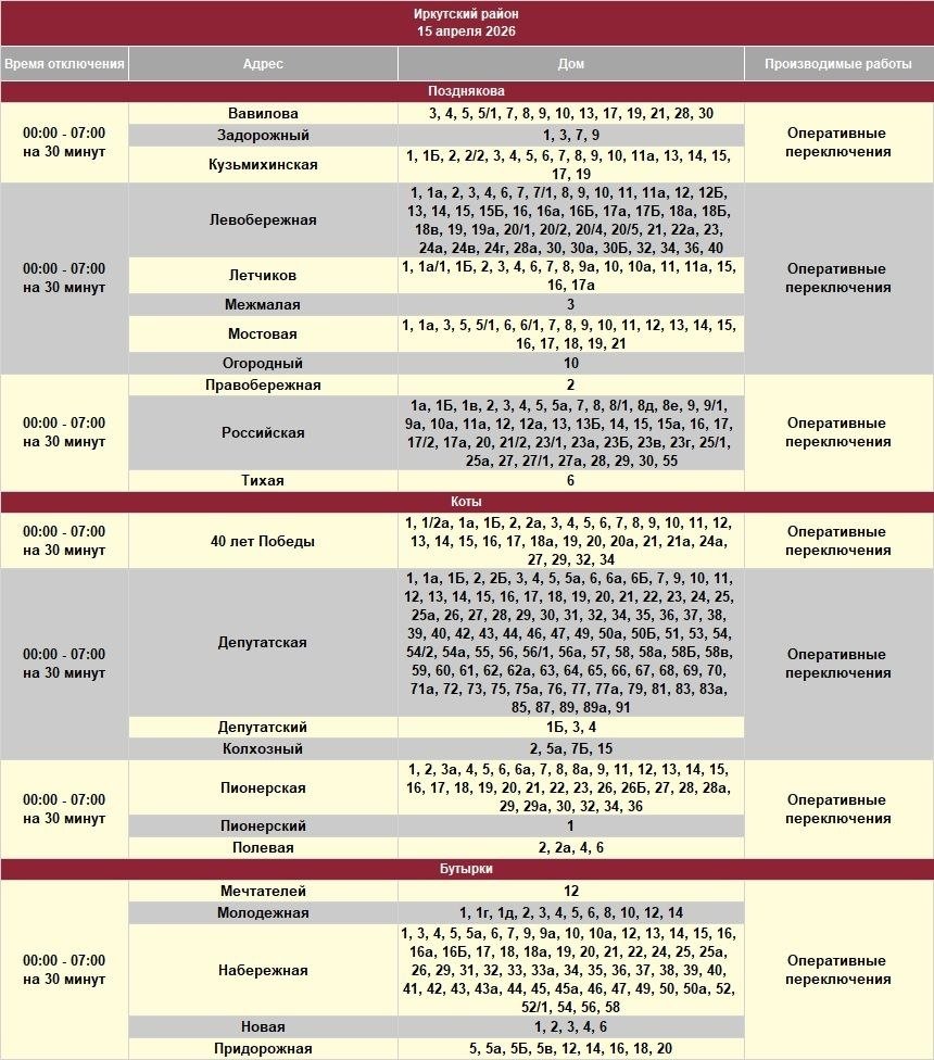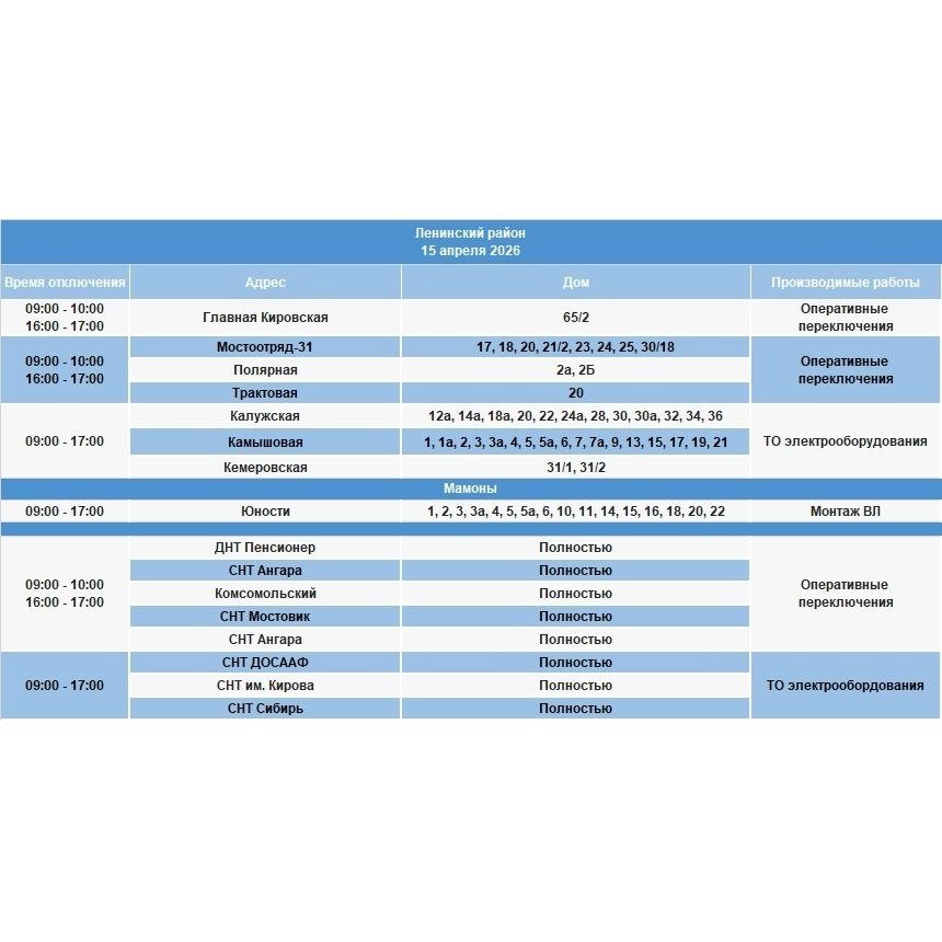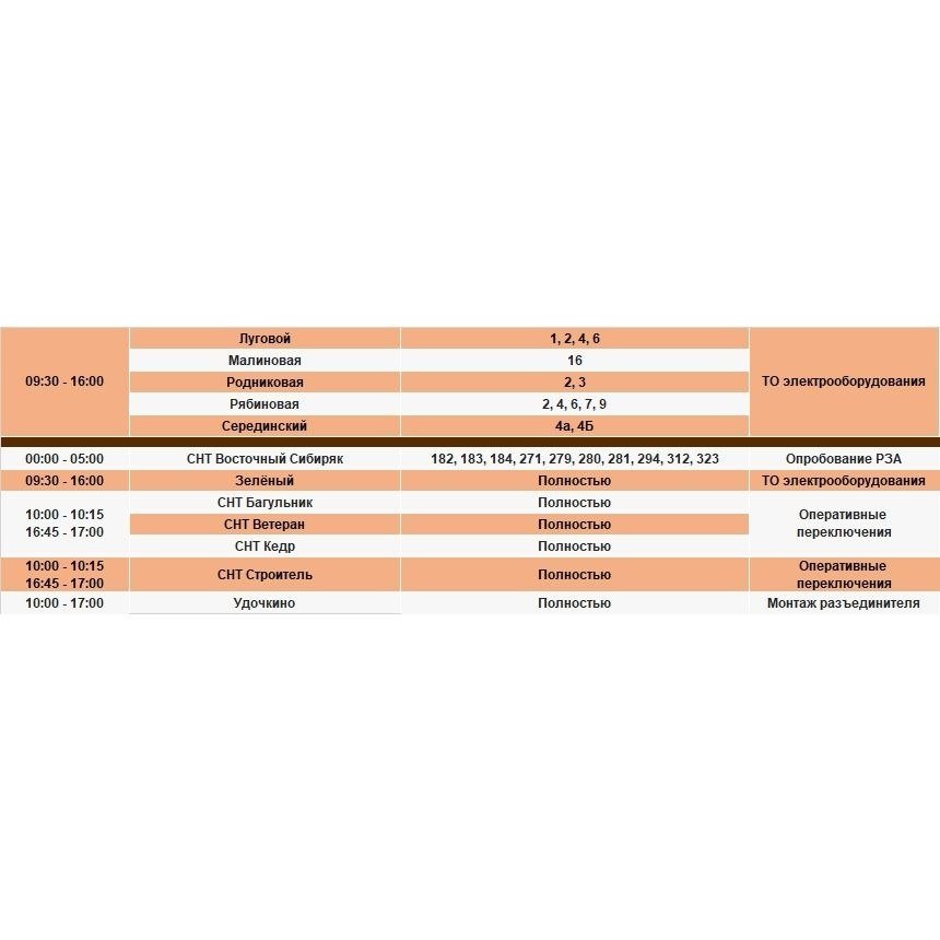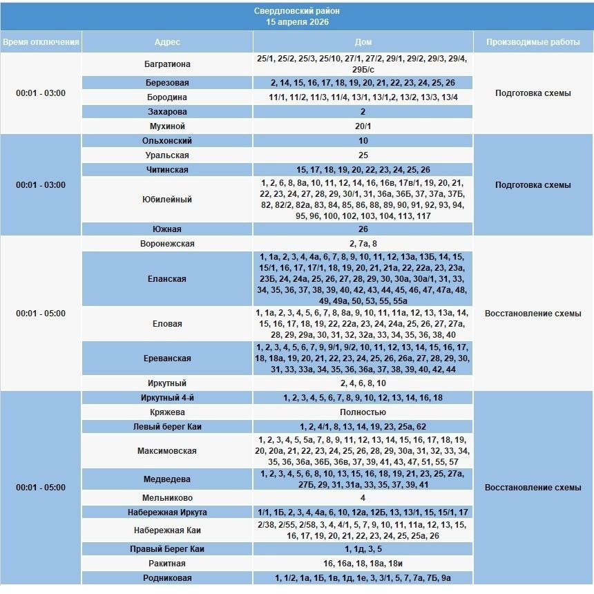 В тг-канале "СВЕТ38" (18+) сообщается, что специалисты проведут профилактические ремонтные и строительные работы на электросетях.