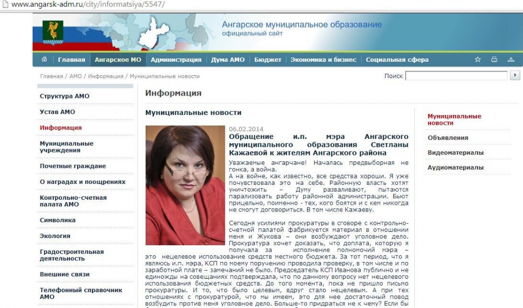 "Уважаемые ангарчане! Началась предвыборная не гонка, а война. А на войне, как известно, все средства хороши. Я уже почувствовала это на себе. Районную власть хотят уничтожить – Думу разваливают, пытаются парализовать работу районной администрации. Бьют прицельно, поименно - тех, кого боятся и с кем никогда не смогут договориться. В том числе Кажаеву. Сегодня (7 февраля – АВТ.) усилиями прокуратуры в сговоре с контрольно-счетной палатой фабрикуется материал в отношении меня и Жукова – они возбуждают уголовное дело. Прокуратура хочет доказать, что доплата, которую я получала за исполнение полномочий мэра – это  нецелевое использование средств местного бюджета", - пишет в обращении Светлана Кажаева.