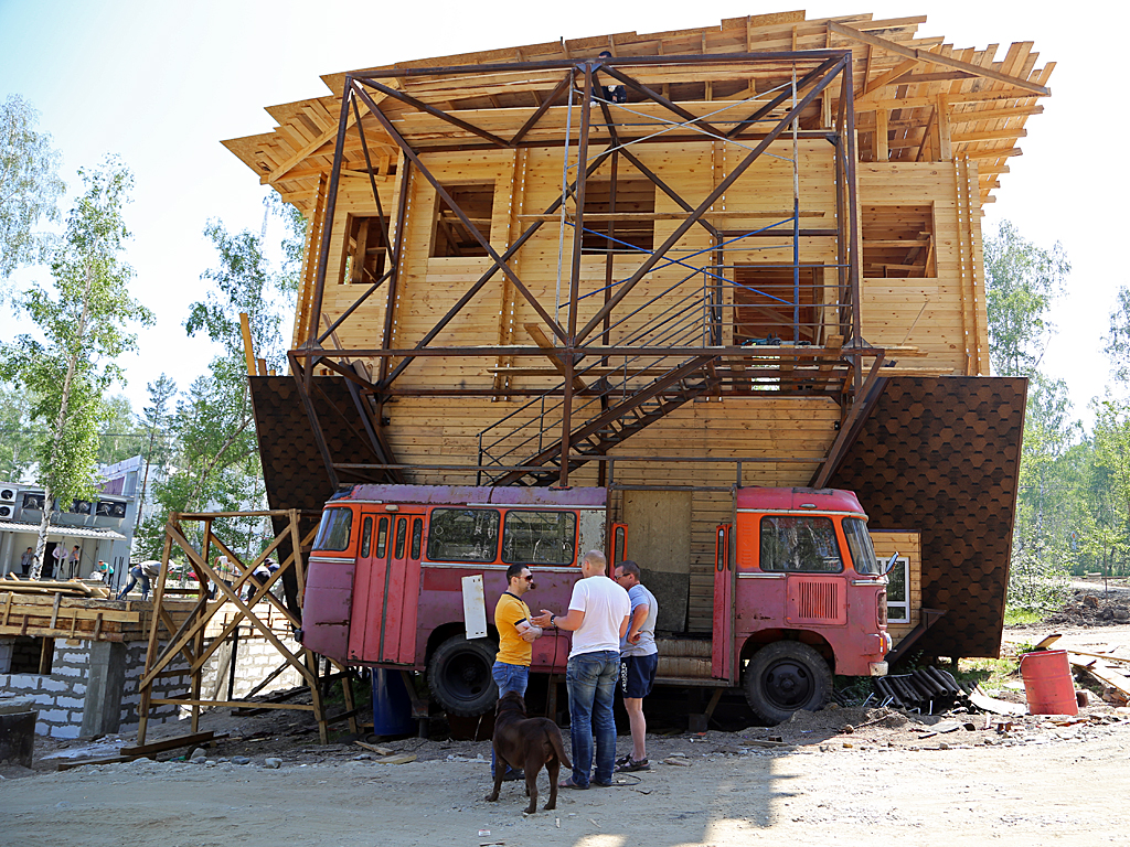 Семейное кафе в доме-"перевертыше" мечтает открыть художник из Иркутска Алексей Муравьев. Мужчина начал строить необычный арт-объект в микрорайоне Березовом в марте 2015 года. Завершить стройку он планирует в конце года. Об этом сообщает ИА IrkutskMedia.