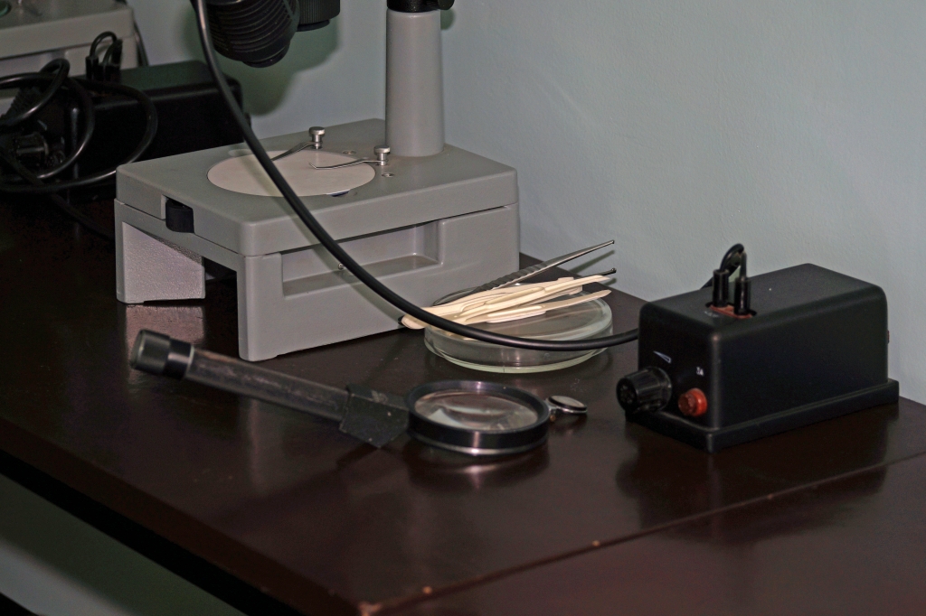 В криминалистической лаборатории представлены поддельные денежные купюры и дипломы, фототехника 20 века, большая коллекция оружия, гипсовые слепки, криминалистические чемоданы для сбора биологических следов преступления и многое другое.