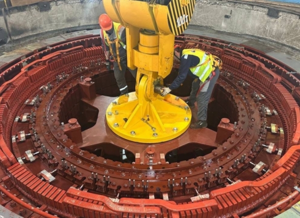 Следующим важным этапом стали работы по установке рабочего колеса гидротурбины, крышки и вала турбины на штатные места. Особо следует отметить, что зазор между лопастями турбины, имеющей диаметр 3 метра, и стенками камеры составляет всего 2,5 мм. На завершающей стадии на свое постоянное место был установлен самый тяжелый элемент гидроагрегата — ротор генератора.