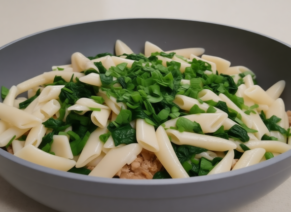 - Выложите в сковороду макароны, добавьте свежей зелени и перемешайте.