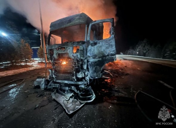 Грузовик загорелся на трассе из-за короткого замыкания в Тайшетском районе. Фото: Пресс-служба ГУ МЧС России по Иркутской области