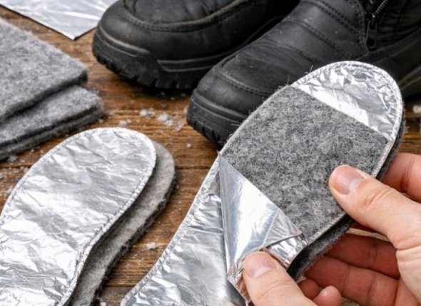Суть лайфхака проста: из плотной фольги для выпечки вырезают стельки по размеру зимней обуви. На одну стельку используют два слоя фольги, между которыми прокладывают войлок. Слои фиксируют, чтобы они не сбивались, и вставляют в сапоги. Такая конструкция отражает холод и удерживает тепло, снижая риск переохлаждения и обморожения.