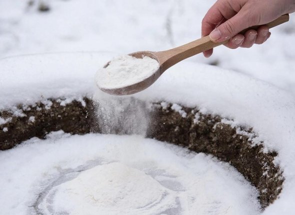 Идеальное время — конец зимы или ранняя весна, когда на земле ещё лежит снег, а до посадок остаётся несколько недель. Мука успеет насытить почву.