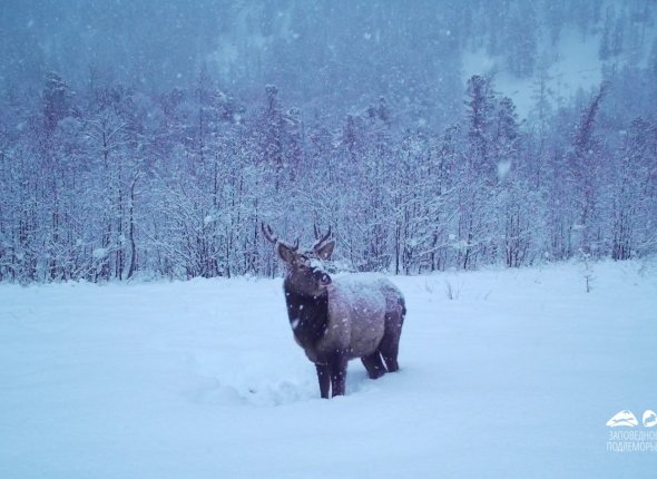 Массивный самец изюбря попал в объектив фотоловушки во Фролихинском заказнике на северо-восточном побережье Байкала. Олень рыхлил снег в поисках корма: сухих веток, коры и стеблей кустарников, лишайников.