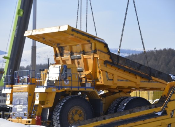 С помощью двух мощных кранов кузова устанавливаются на самосвал. Всё. Техника готова к эксплуатации. Этот и другие белорусские многотонники пополнят парк большегрузной техники, который задействован на опытно-промышленной разработке одного из крупнейших золоторудных месторождений мира — Сухой Лог.