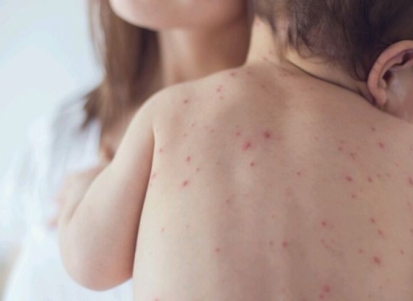 На четвертый-пятый день болезни к симптомам присоединяется сыпь. Сначала она покрывает лицо, область за ушами и шею. После чего постепенно спускается вниз, переходя на туловище, а затем на руки и ноги.